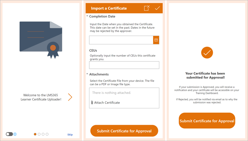 Der Lernende greift auf die App zu, die in einen Learn365-Kurs eingebettet ist. Nach Bearbeiten des Tutorials kann der Lernende die Zertifikatsdatei über ein Formular zur Genehmigung hochladen. Nach der Einreichung zeigt eine Bestätigungsseite an, dass das Zertifikat zur Genehmigung eingereicht wurde. Der Genehmigende erhält eine Benachrichtigung in Microsoft Teams und per E-Mail, in der er gebeten wird, die Einreichung zu genehmigen oder abzulehnen. Sobald die Genehmigung erteilt wurde, wird der Lernende per E-Mail darüber informiert, dass sein Zertifikat genehmigt und seine Schulungsunterlagen in Learn365 aktualisiert wurden.