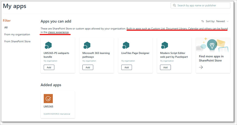 5. Im Bereich Apps, die Sie hinzufügen können auf der Seite Meine Apps klicken Sie auf den Hyperlink im Satz „Integrierte Apps … sind auf der klassischen Benutzeroberfläche zu finden.“