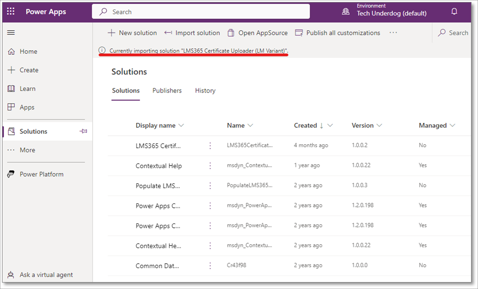 „Learner Certificate Uploader (LM Variant)“ enthält mehrere Komponenten, die Teil des Lösungspakets sind. Die Installation der Lösung umfasst die folgenden Schritte: