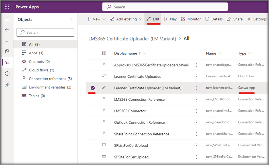16. Wählen Sie die Canvas-App Learner Certificate Uploader (LM Variant) aus und klicken Sie im oberen Menü auf Bearbeiten.