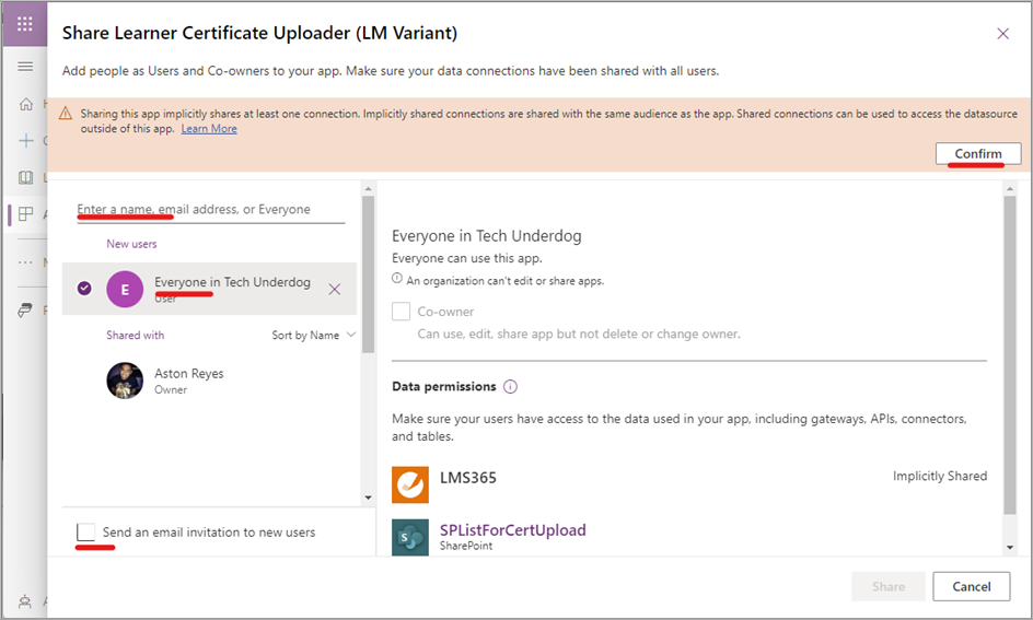 2. Geben Sie alle Benutzer ein, die die Power App verwenden müssen. Sie können hier vorzugsweise die Gruppe Alle hinzufügen, um sicherzustellen, dass alle Mitglieder der Organisation über die erforderlichen Berechtigungen für die Anwendung verfügen. Sie können sie auch als Mitbesitzer festlegen, wenn Sie möchten, dass sie die App bearbeiten können. Ferner können Sie die Option E-Mail-Einladung an neue Benutzer senden je nachdem, ob Sie diese benachrichtigen möchten, aktivieren oder deaktivieren.