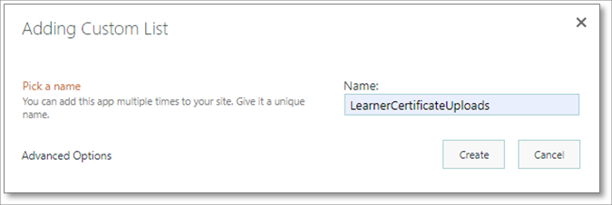 6. Auf der Seite Ihre Apps wählen Sie Learner Certificate Uploader SP List aus und geben LearnerCertificateUploads in das Feld Name ein.