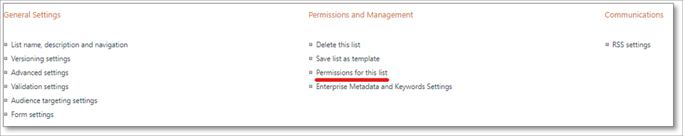 8. Wählen Sie Berechtigungen für diese Liste aus.