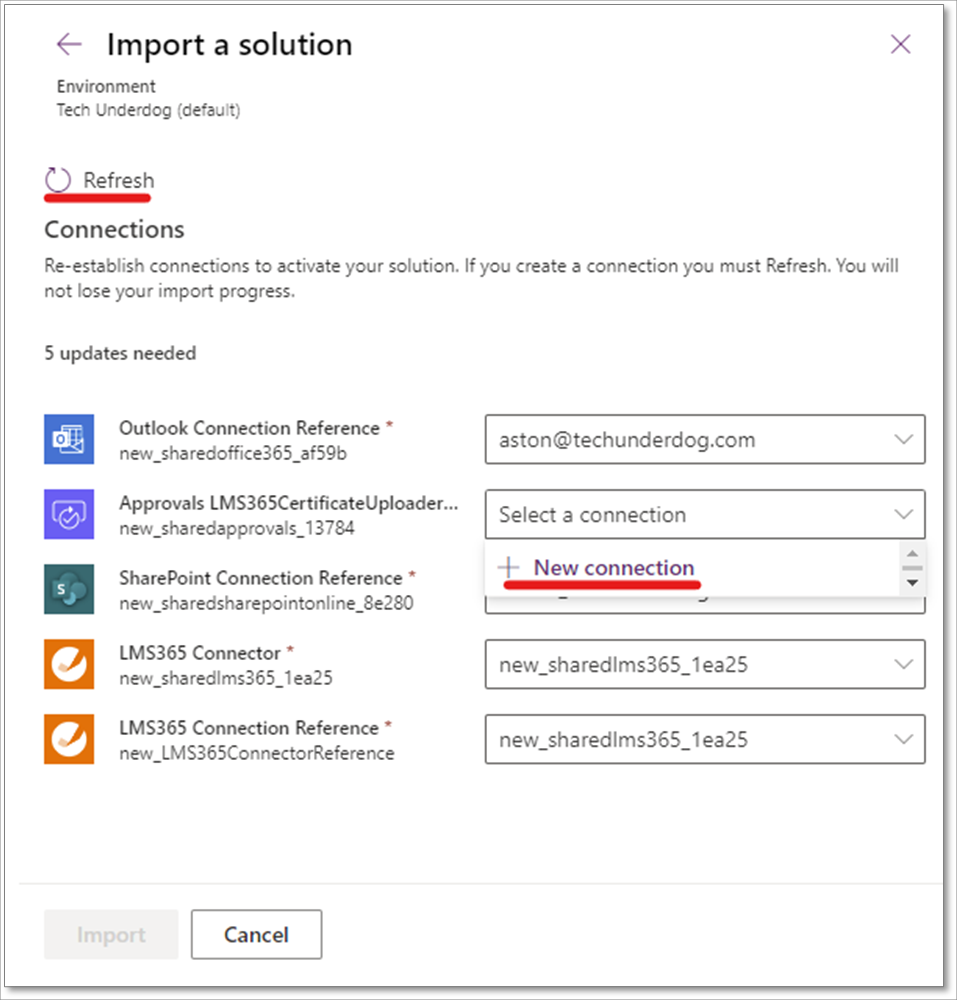 8. Sie müssen jedes Element vor dem Import verbinden. Wählen Sie dazu im Dropdown-Menü für das jeweilige Element das Konto aus, das Sie für die Lösung verwenden möchten. Wenn keine Elemente vorhanden sind, wählen Sie +Neue Verbindung aus.