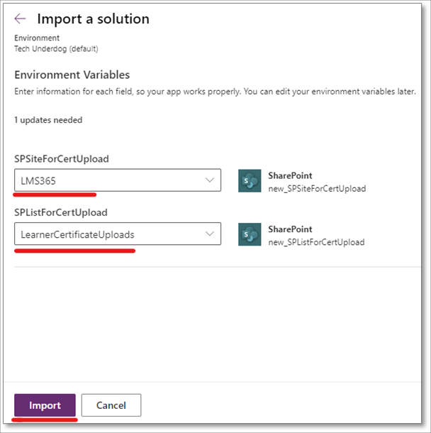 14. Wählen Sie in den Dropdown-Menüs Ihre Learn365-Katalogwebsite und die Liste Learner Certificate Uploads aus. Nachdem Sie die Website und die Liste ausgewählt haben, klicken Sie auf Importieren, um den Variablenimport zu starten.