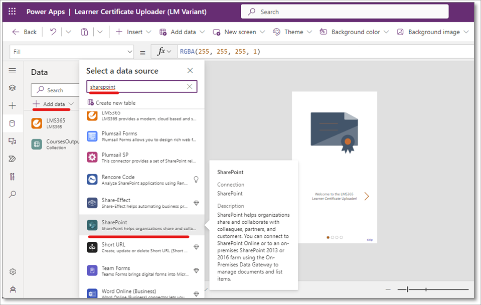 19. Wählen Sie den Abschnitt +Daten hinzufügen aus, und suchen Sie nach SharePoint.