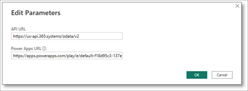 5. Öffnen Sie das Menü Daten transformieren, klicken Sie auf Parameter bearbeiten, kontrollieren Sie, ob das Feld API-URL zur Region Ihres Learn365-Mandanten passt, und aktualisieren Sie es erforderlichenfalls.