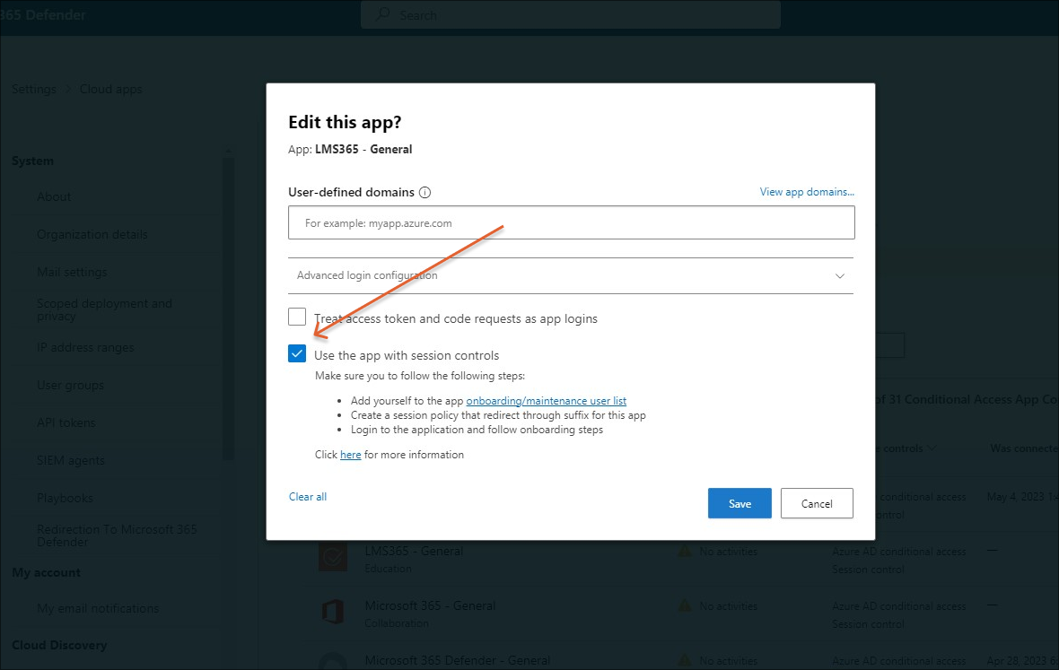 4. Im geöffneten Fenster aktivieren Sie das Kontrollkästchen App mit Sitzungssteuerungen verwenden. Standardmäßig sollte diese Einstellung aktiviert sein. Wenn aktiviert, wird „mcas.ms“ zur URL des Learn365 Admin Centers hinzugefügt.