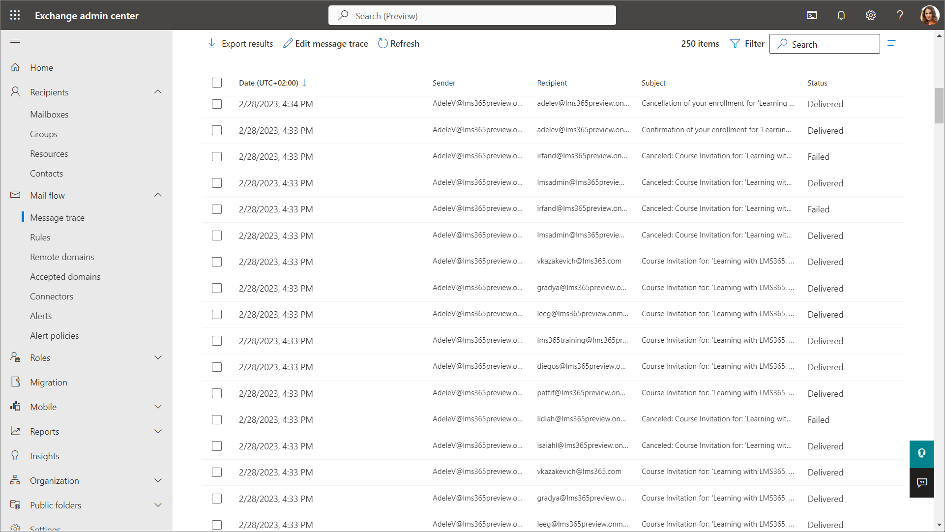 Learn365 nutzt zum Versenden von E-Mail-Benachrichtigungen Microsoft 365. Sie können die Nachrichtenablaufverfolgung im Microsoft 365 Exchange Admin Center einsehen, um nachzuvollziehen, ob Benachrichtigungs-E-Mails an Benutzer gesendet wurden.