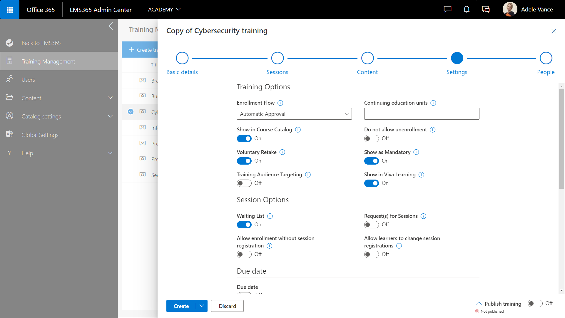 - Der Name weist den Kurs als Kopie eines Ursprungskurses aus, kann aber vom Katalogadministrator geändert werden. Beispielsweise erhält eine Kopie eines Kurses namens Datenvisualisierung standardmäßig den Namen Kopie von Datenvisualisierung.