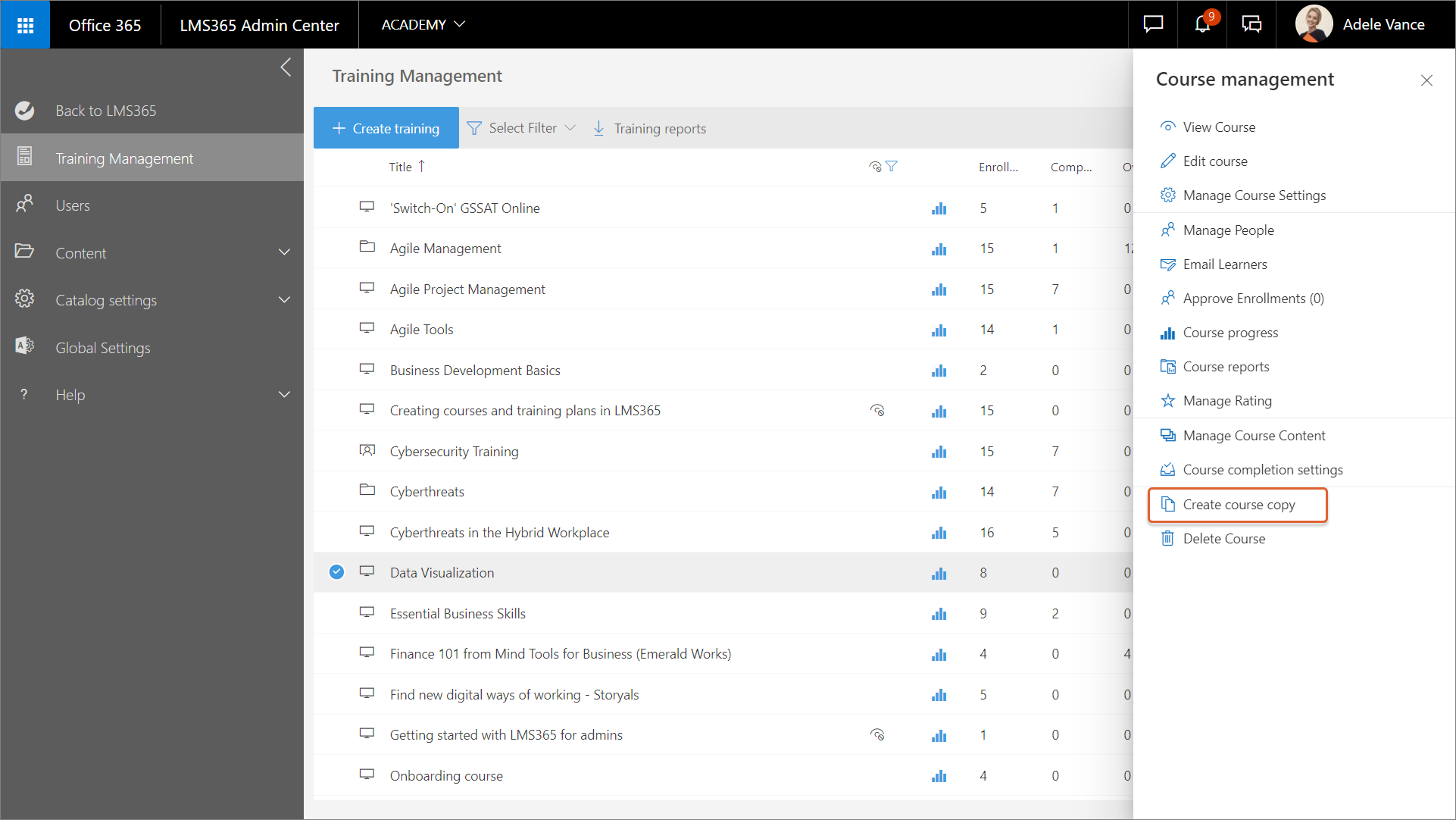 1. Wählen Sie auf der Seite Schulungsverwaltung den E-Learning- oder veranstaltungsbasierten Kurs aus, den Sie kopieren möchten.