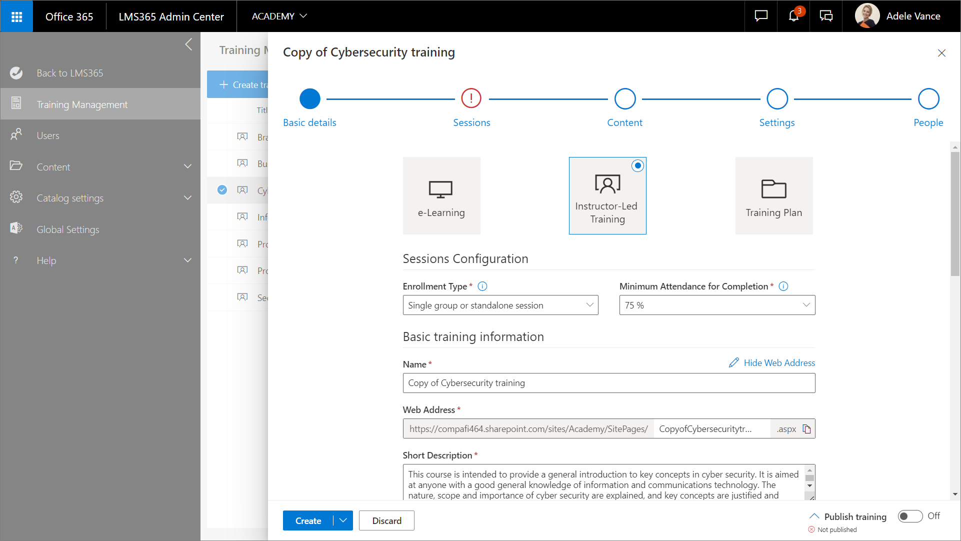 - Das Feld Webadresse wird automatisch erweitert und mit dem Namen Copyof(Kursname) vorkonfiguriert. Beispiel: https://compafi464.sharepoint.com/sites/Academy/SitePages/CopyofDatenvisualisierung.aspx.