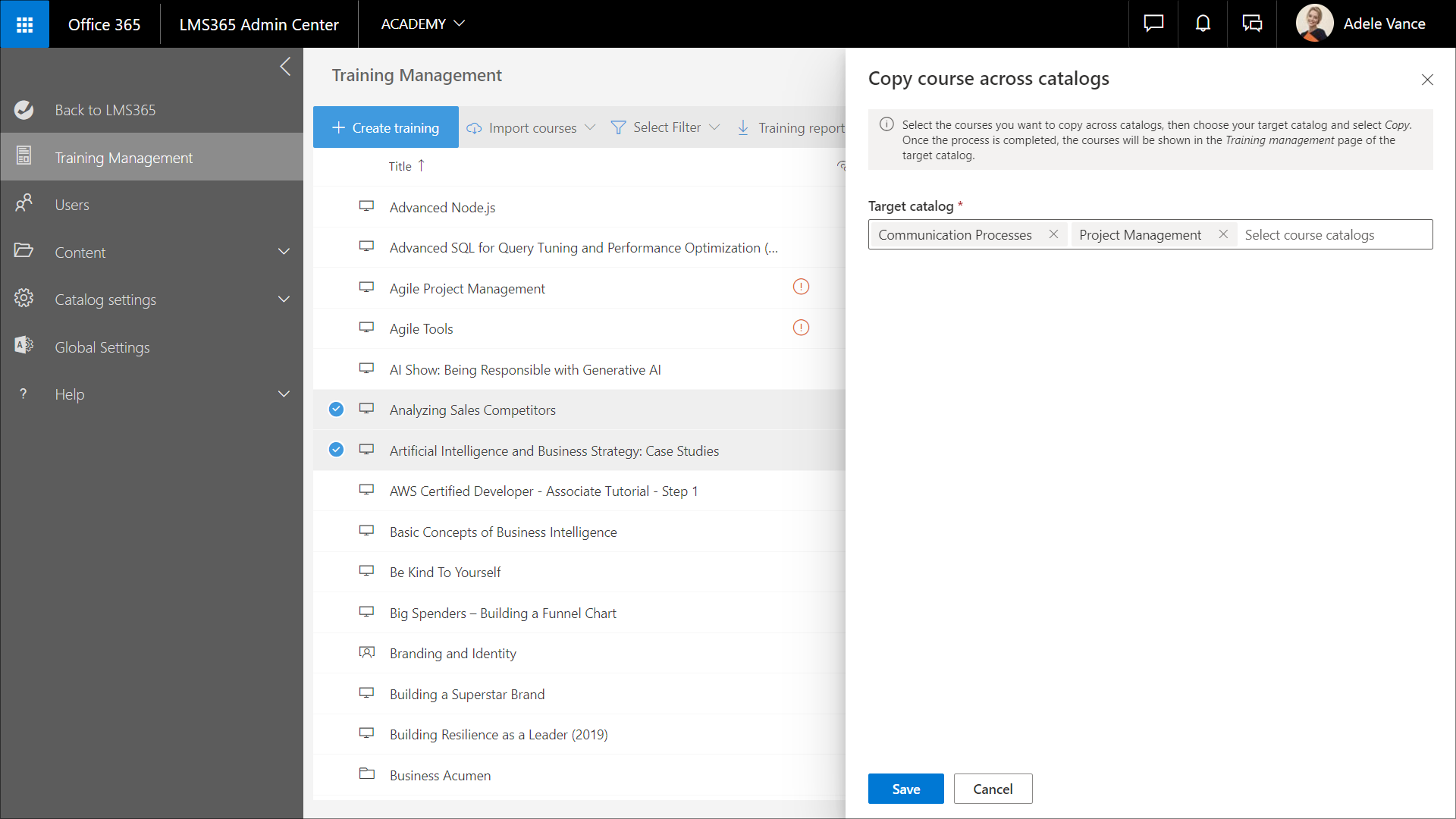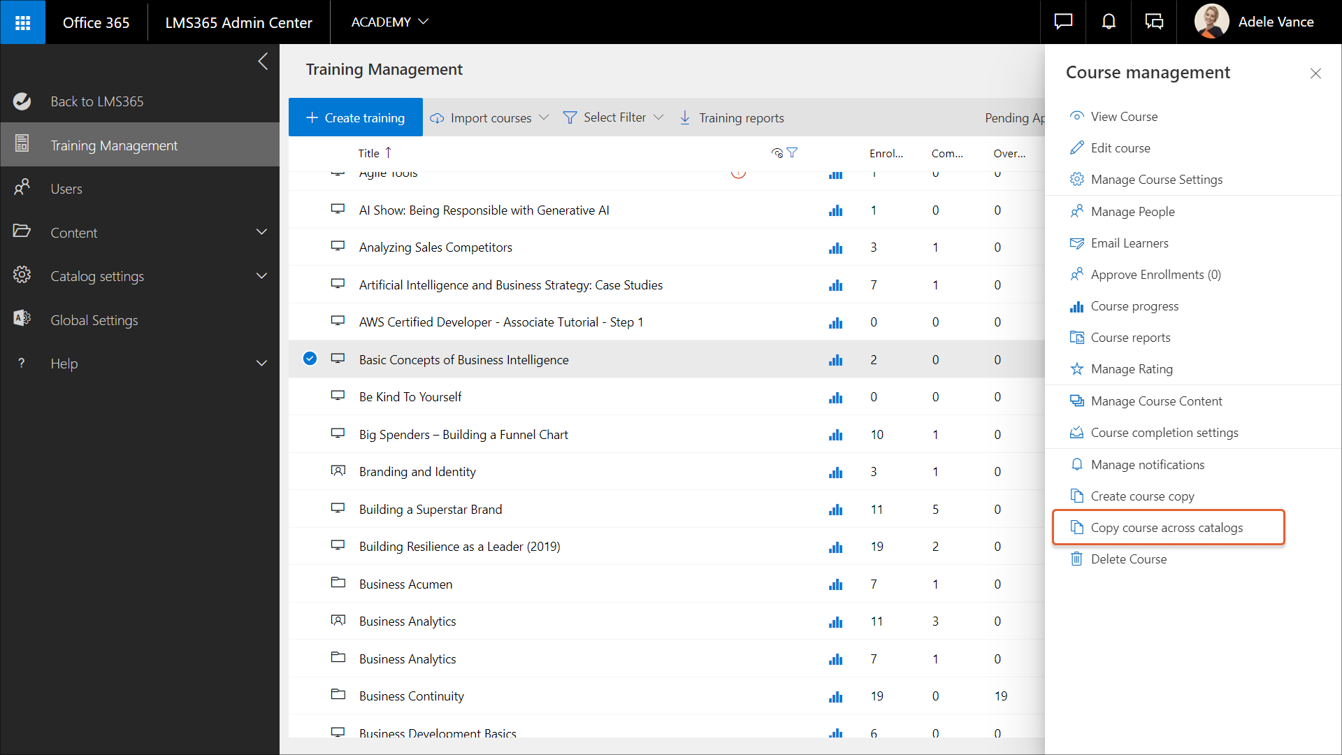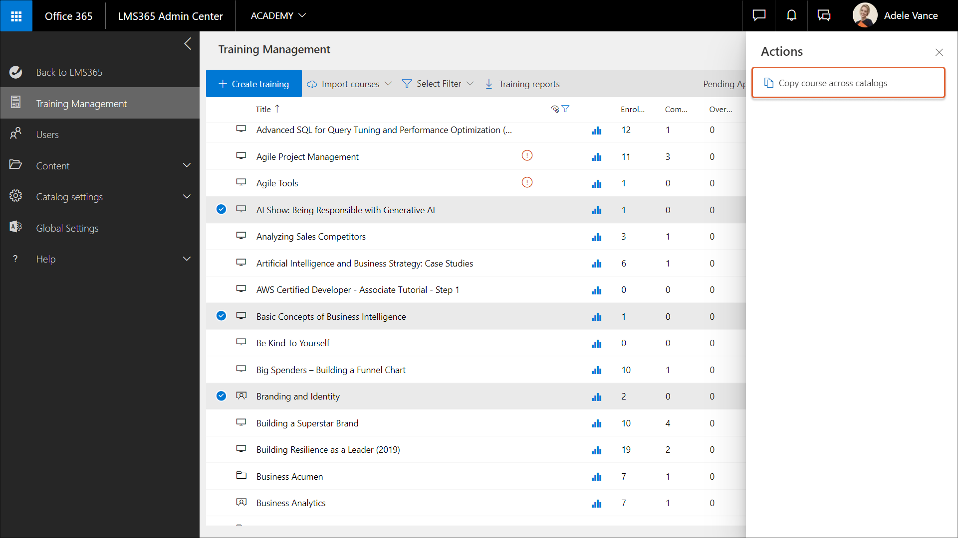 1. Gehen Sie zu Learn365 Admin Center > Schulungsverwaltung und wählen Sie die gewünschten E-Learning-Kurse oder veranstaltungsbasierten Schulungen aus.