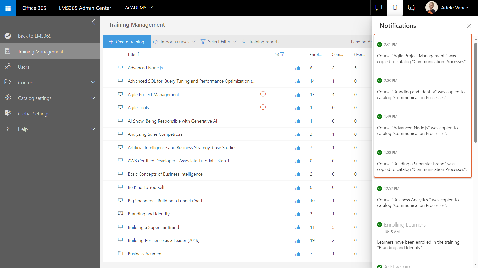 5. Klicken Sie auf Speichern, um die ausgewählten Kurse in die gewünschten Kataloge zu kopieren. Während die Kurse kopiert werden, wird im Bereich Benachrichtigungen für jeden kopierten Kurs eine Fortschrittsbenachrichtigung angezeigt. Nach erfolgreichem Kopieren aller Kurse erscheint dann eine Abschlussmeldung.