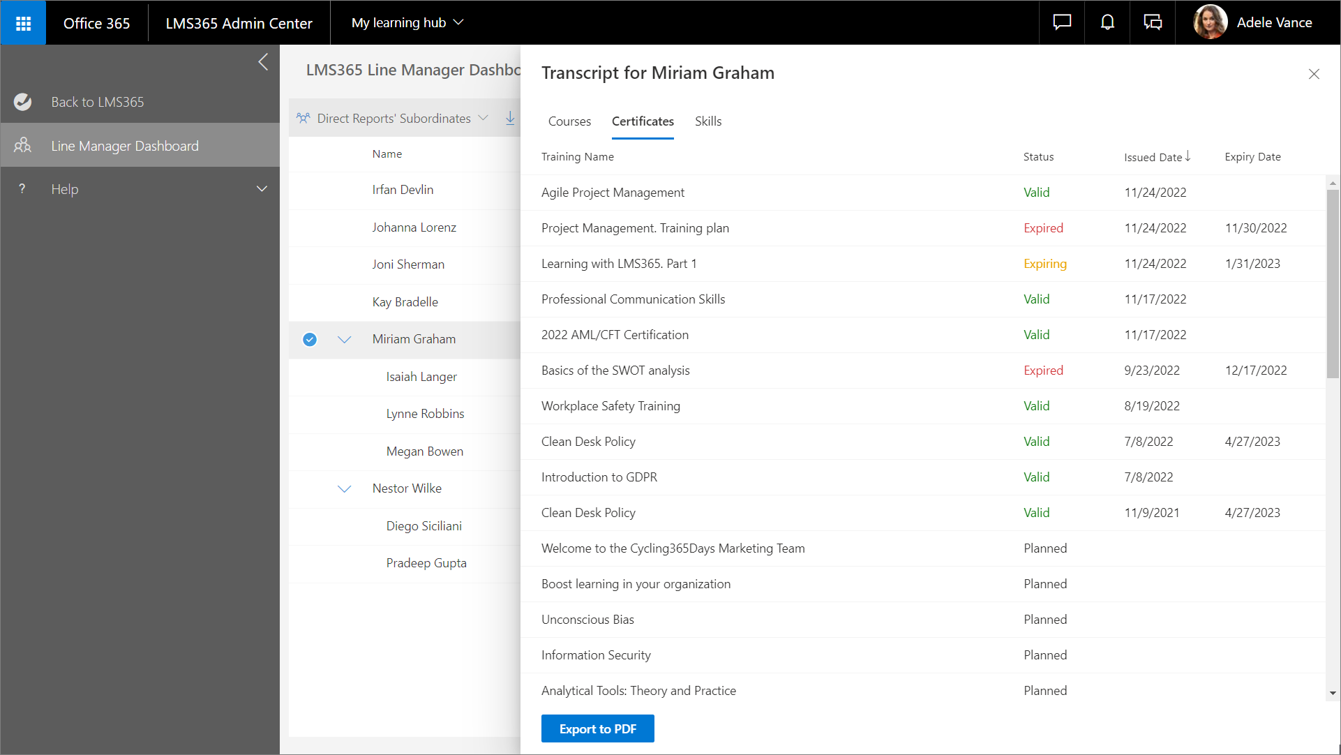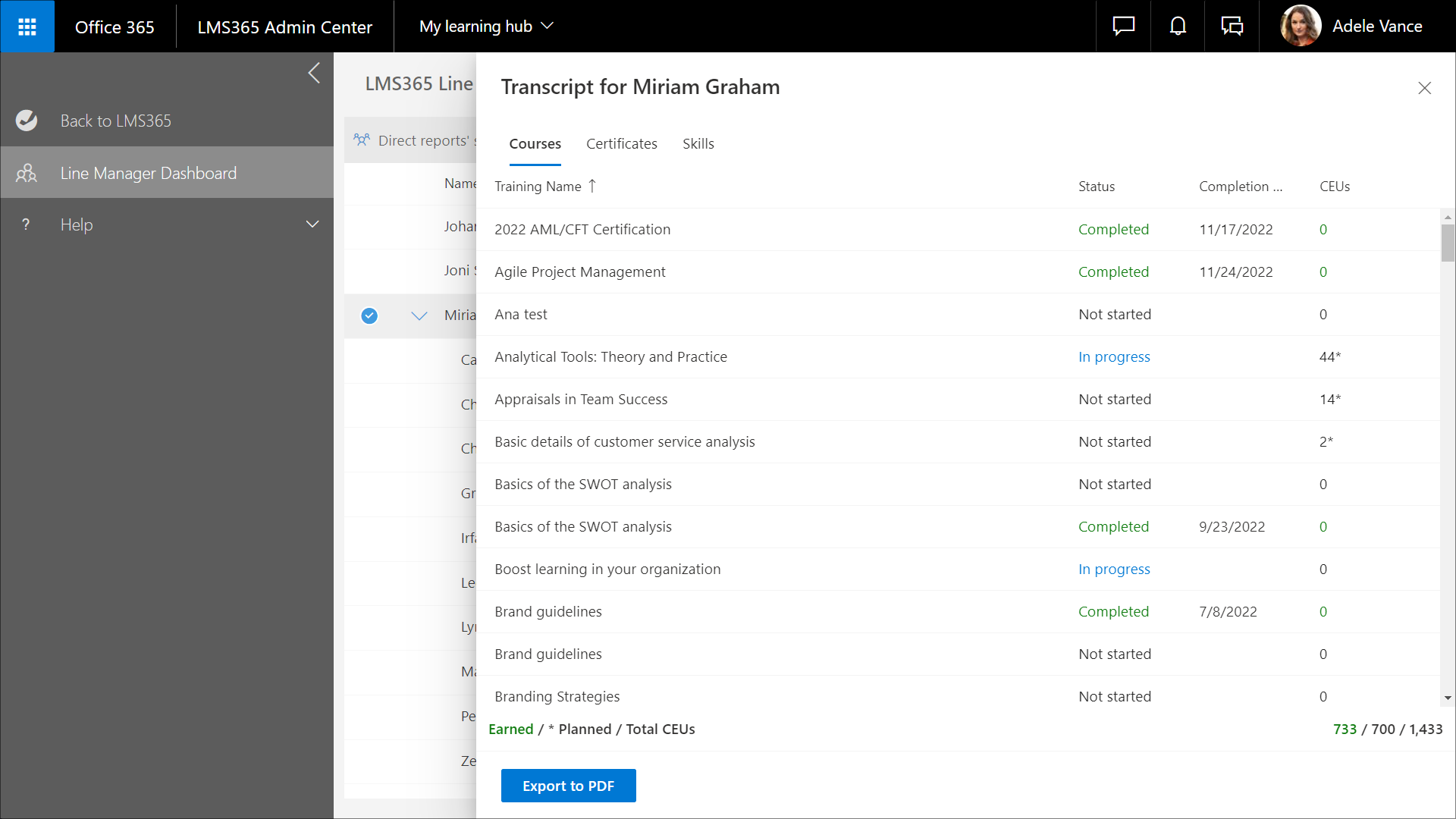 4. Wählen Sie In PDF exportieren aus, um die gesamte Aufzeichnung des Lernenden – inklusive aller eingetragenen Kurse, Schulungspläne, Zertifikate und Qualifikationen – auf ein lokales Gerät herunterzuladen. Diese Option ist auf allen Registerkarten vorhanden und bietet jeweils dieselbe Funktion.