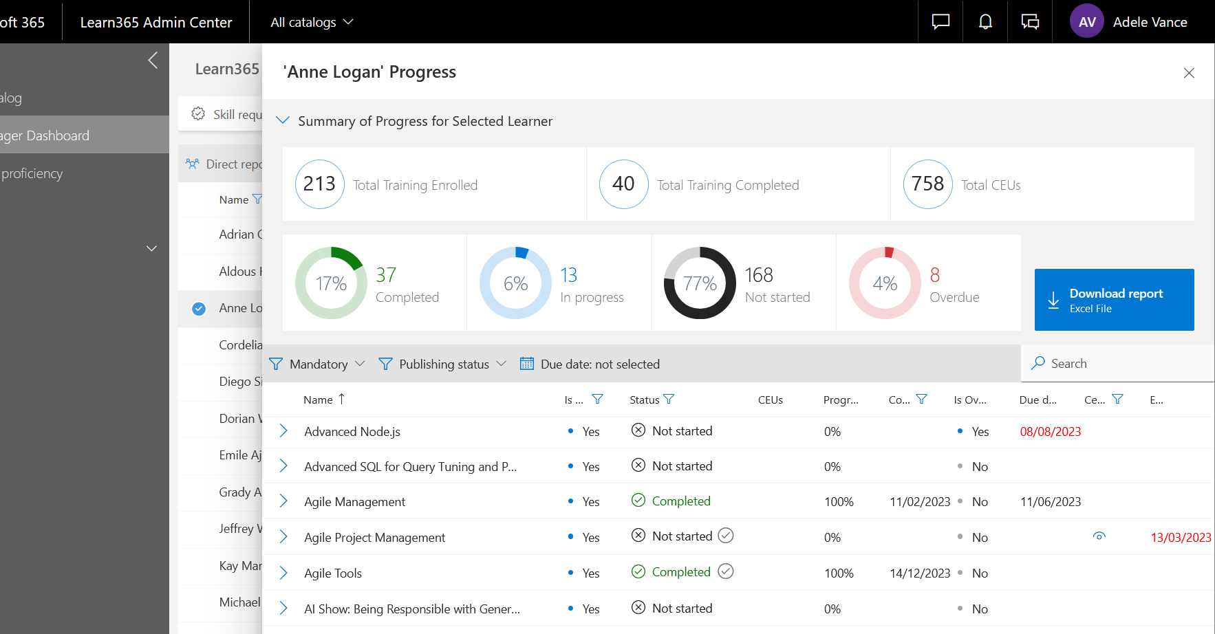 - Wählen Sie Bericht herunterladen, um den Fortschrittsbericht des Lernenden als Excel-Datei auf ihr lokales Gerät herunterzuladen. Informationen zum Lesen dieser Angaben im Bereich Fortschritt finden Sie in diesem Artikel.