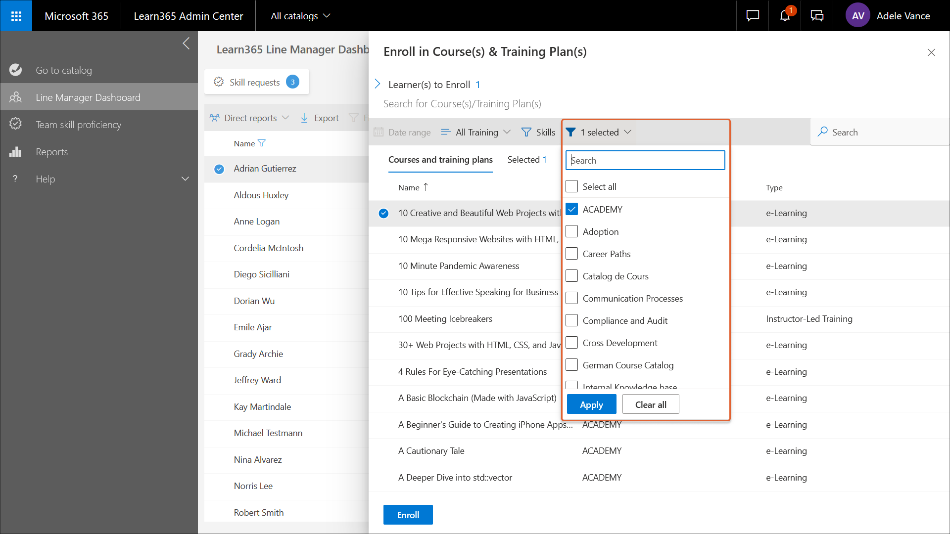 In der Ansicht Alle Kataloge sehen Sie auch den Filter Kataloge. Wählen Sie die Kataloge aus, aus denen Sie Schulungen anzeigen möchten, und klicken Sie dann auf Anwenden. Die Seite zeigt die Kurse und Schulungspläne aus den ausgewählten Katalogen an.