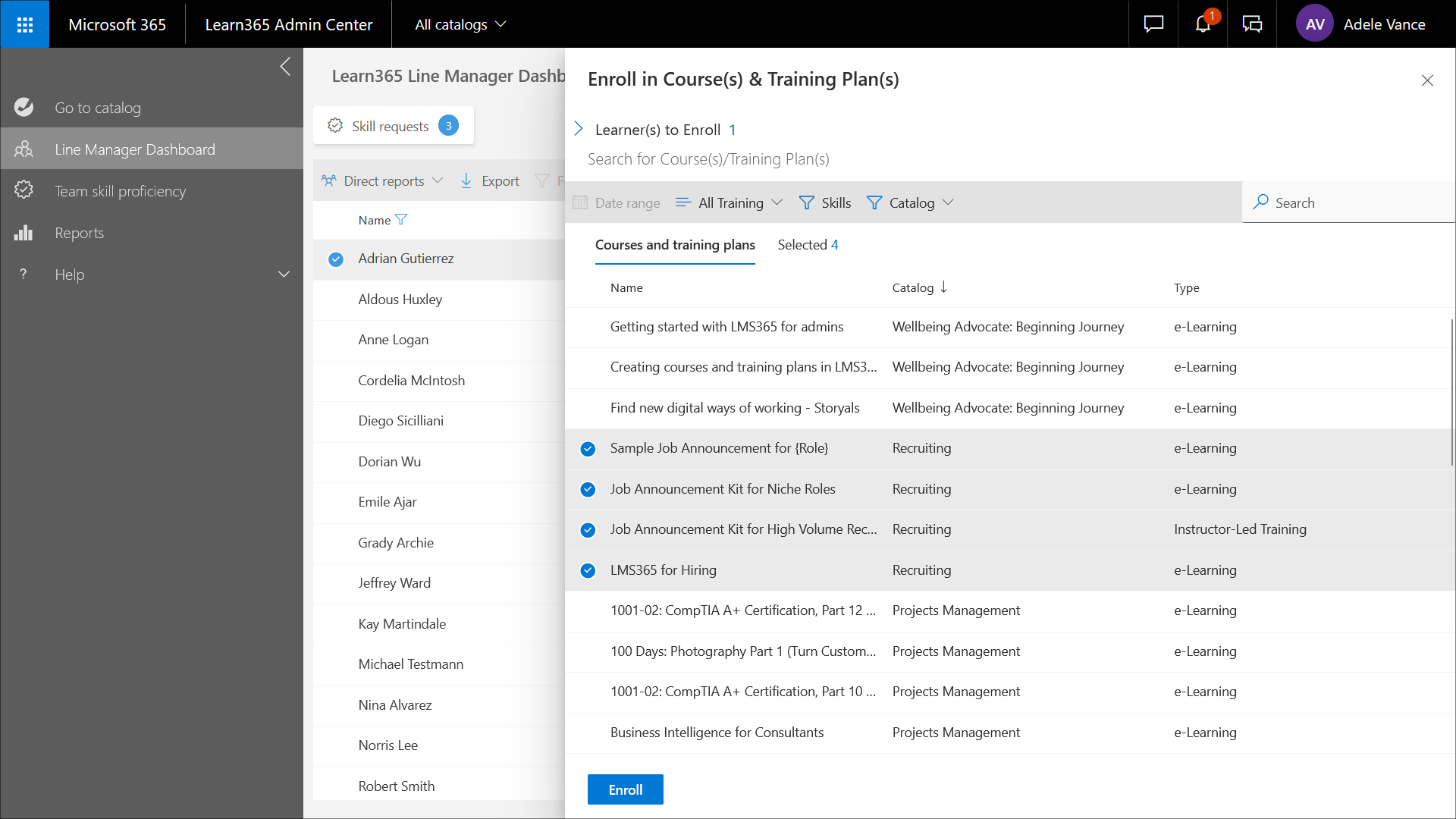 Linienmanager können Lernende beim Anzeigen wahlweise eines einzelnen Katalogs oder von Alle Kataloge für Kurse und Schulungspläne registrieren.