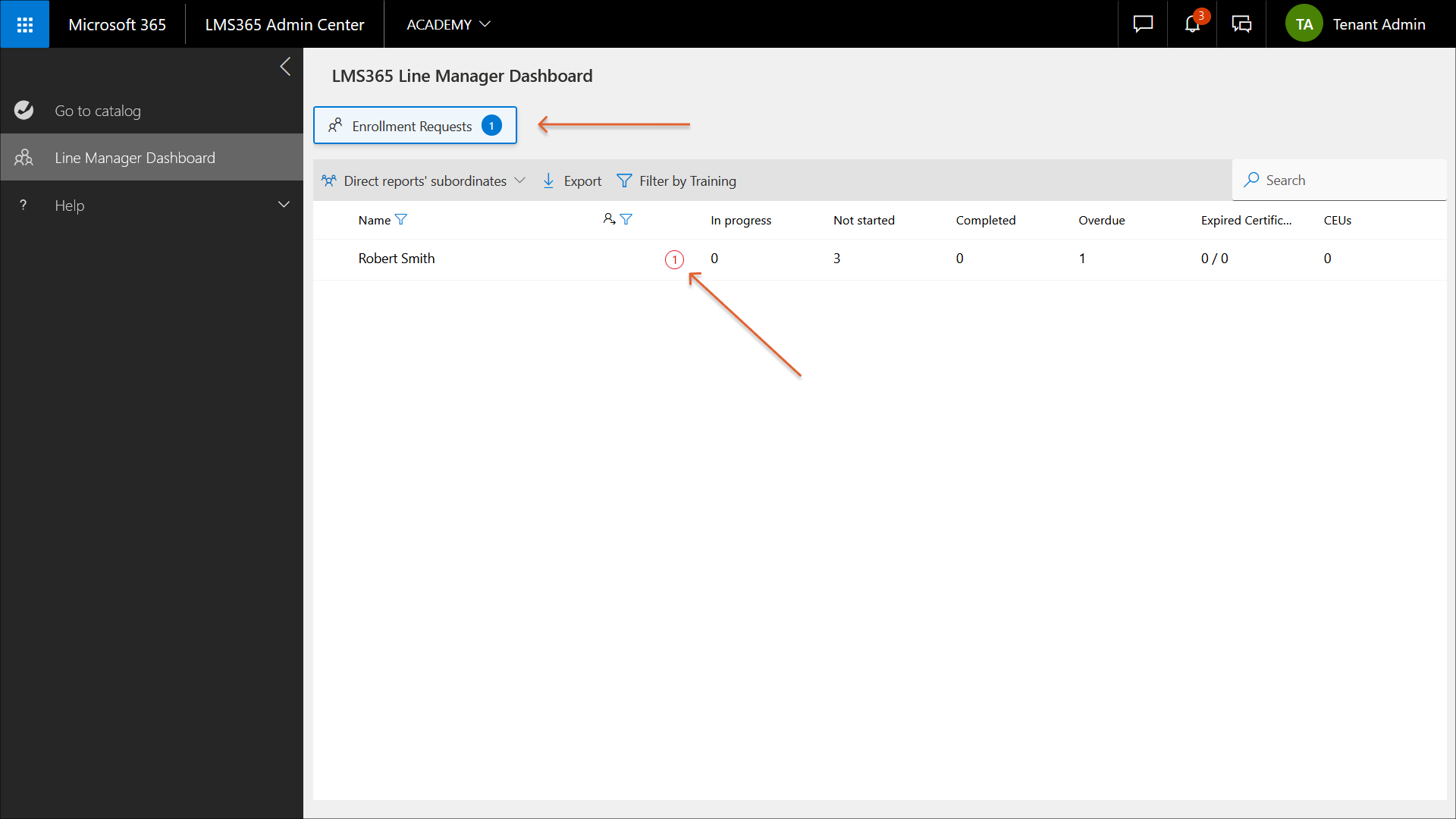 Dieser Artikel behandelt die Optionen zur Benutzerverwaltung im Linienmanager-Dashboard. Sie erfahren hier, wie Linienmanager die Schulungsaktivitäten ihrer Untergebenen beobachten und verwalten, Informationen zu einem bestimmten Katalog oder zu allen Katalogen anzeigen, Registrierungsanfragen und Bewertungen verwalten, Berichte anzeigen und herunterladen, nach Schulungen oder einem Benutzer filtern oder suchen, Benutzerregistrierungen verwalten, Qualifikationen gewähren oder entziehen, Schulungen aus einer externen Quelle importieren und Zertifikate herunterladen können.