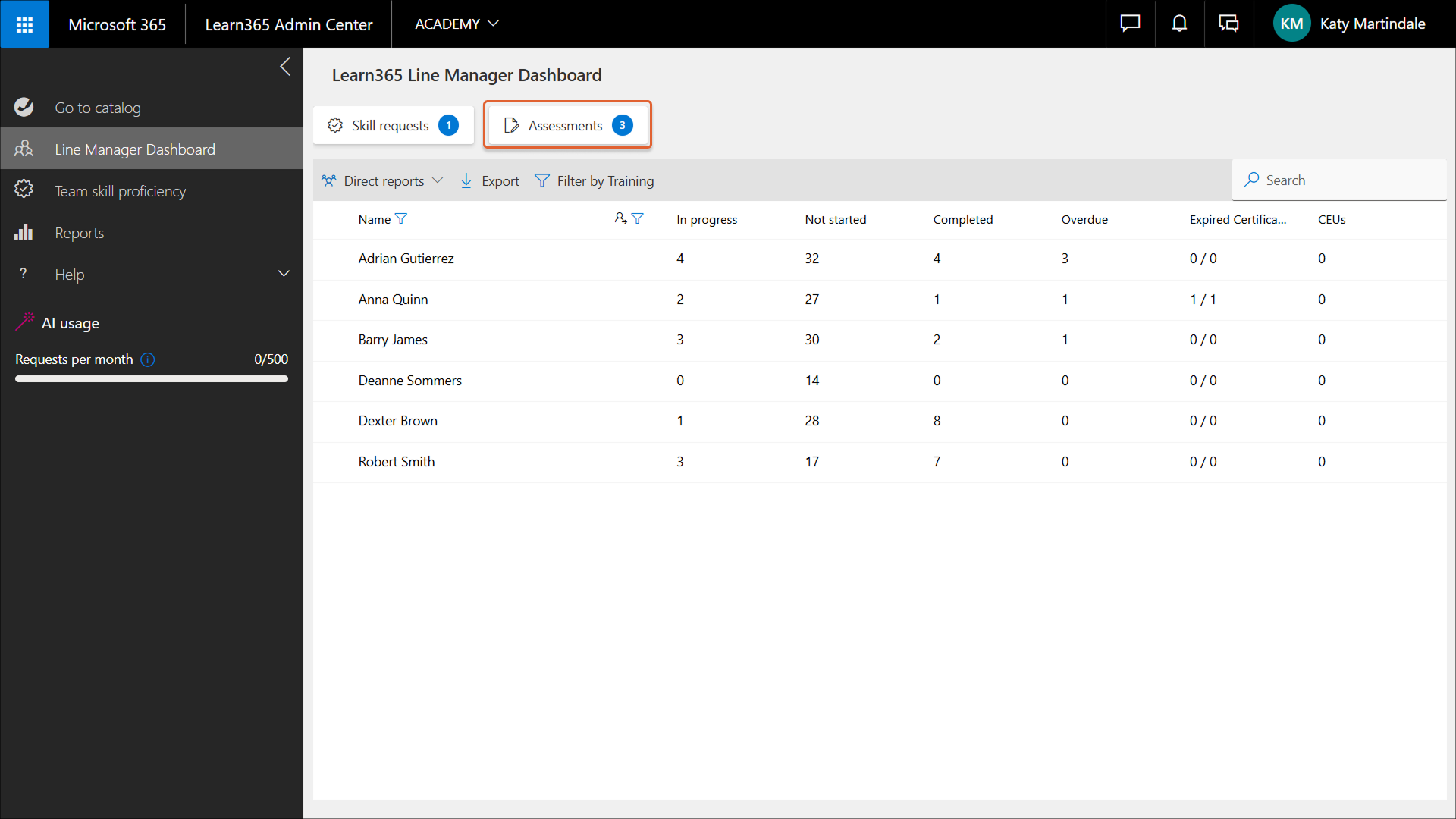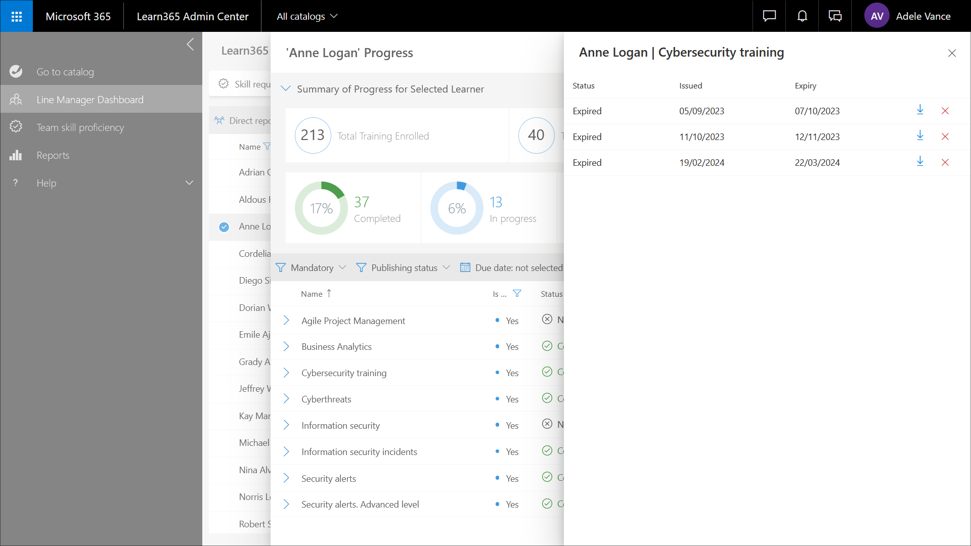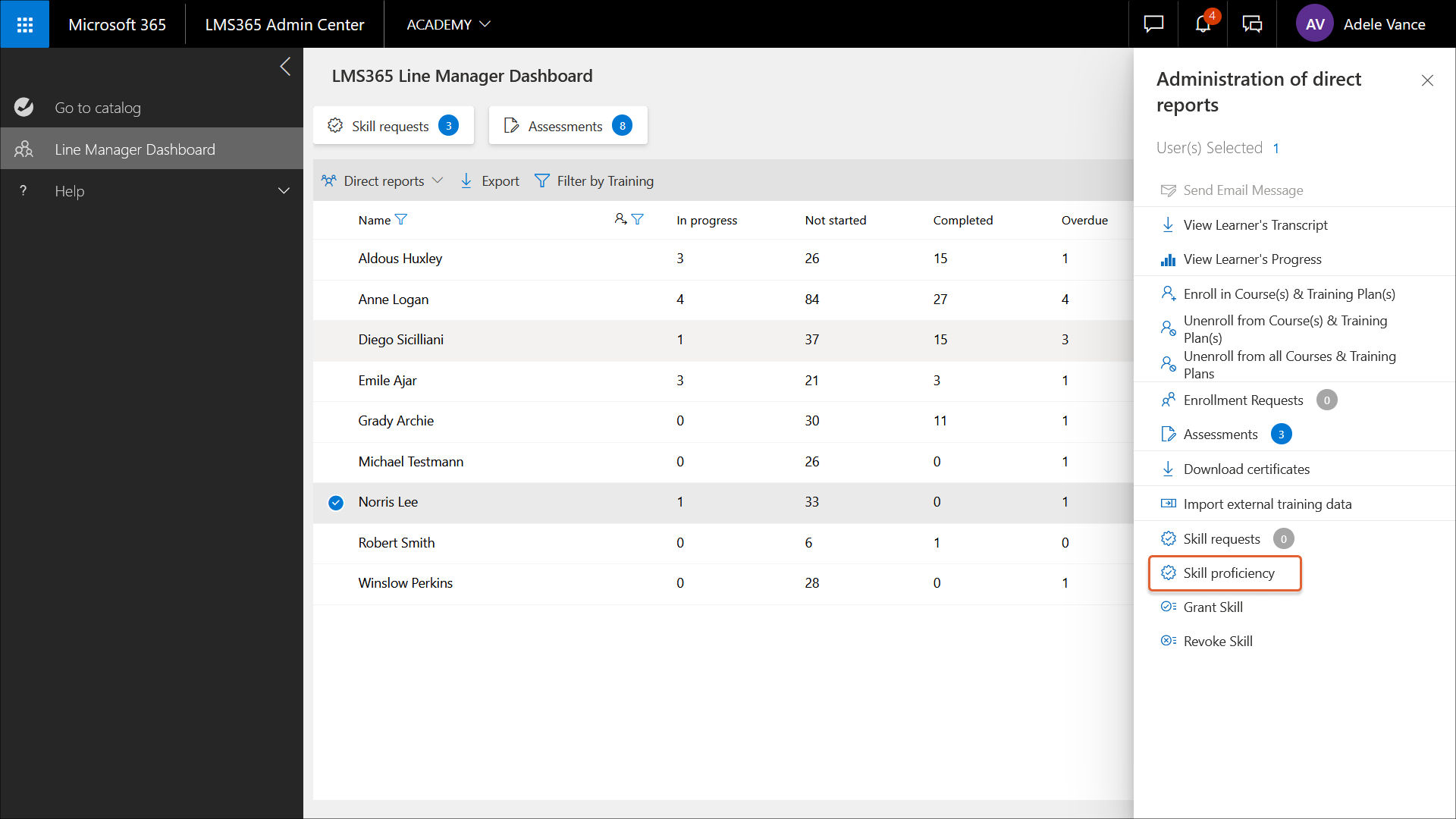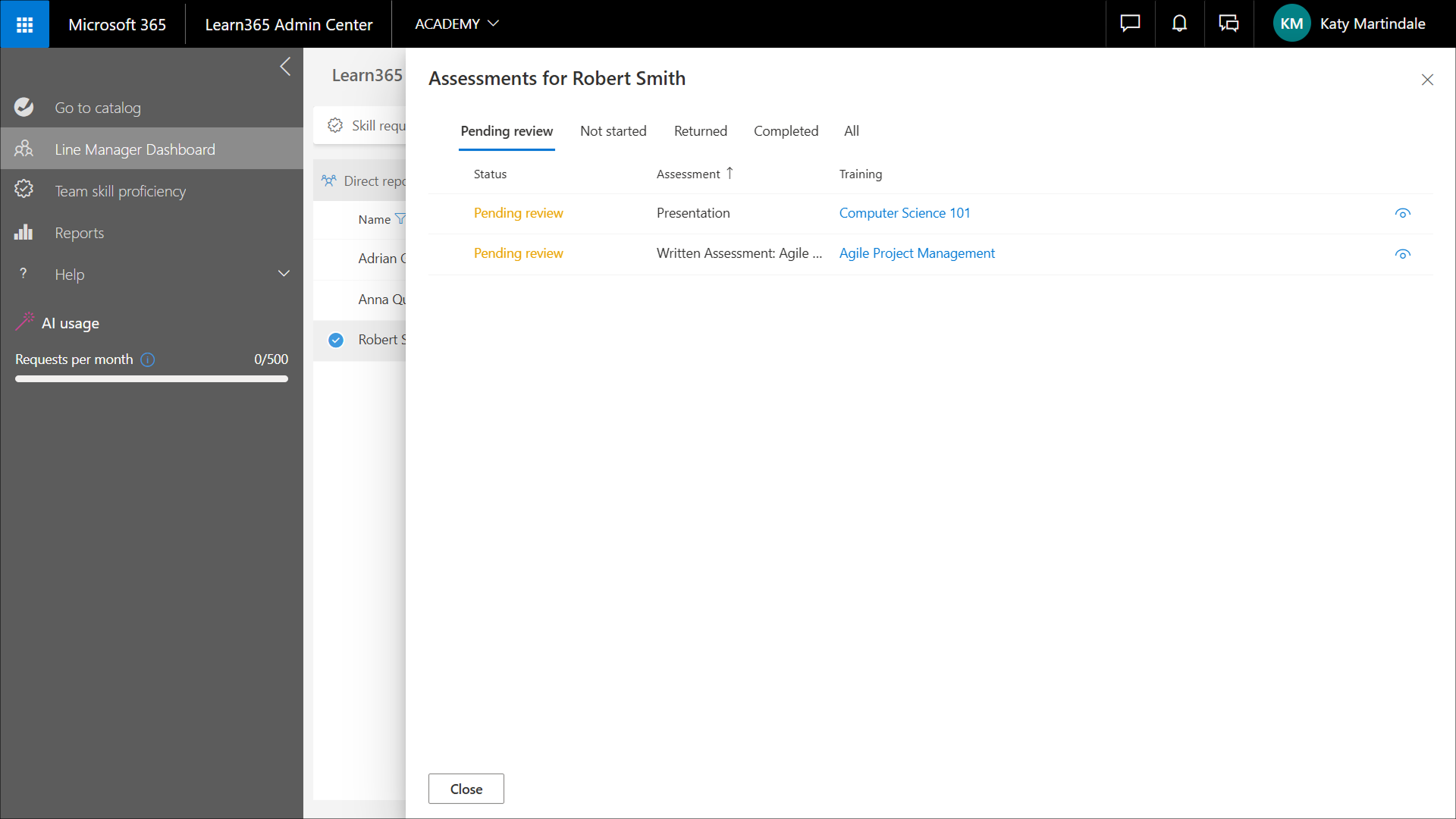 1. Wählen Sie im Linienmanager-Dashboard den gewünschten Lernenden aus. Der Bereich Verwaltung der direkten Mitarbeiter wird geöffnet.