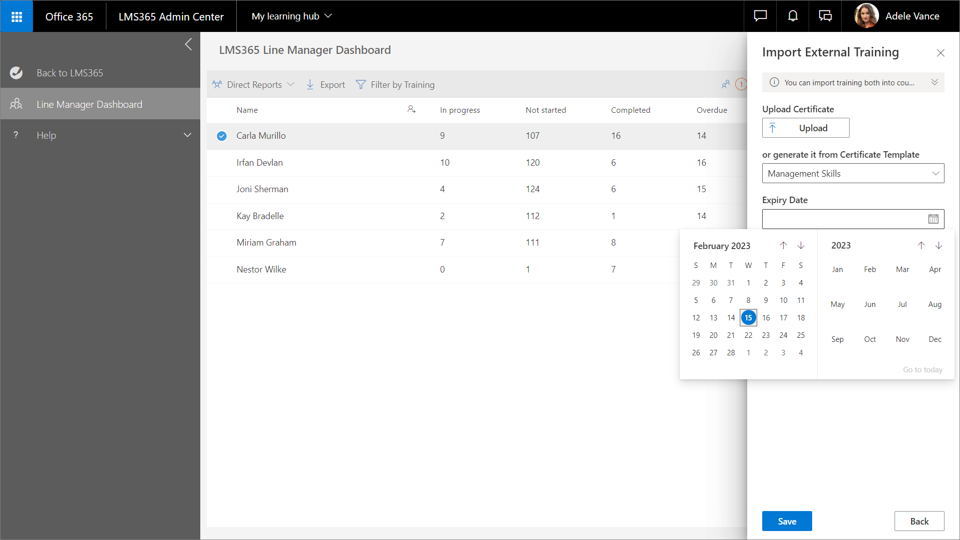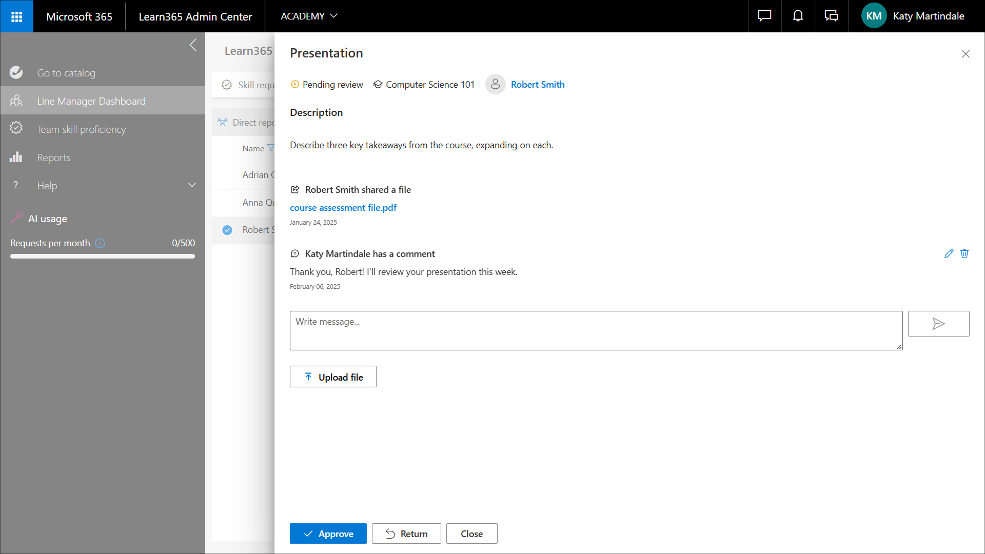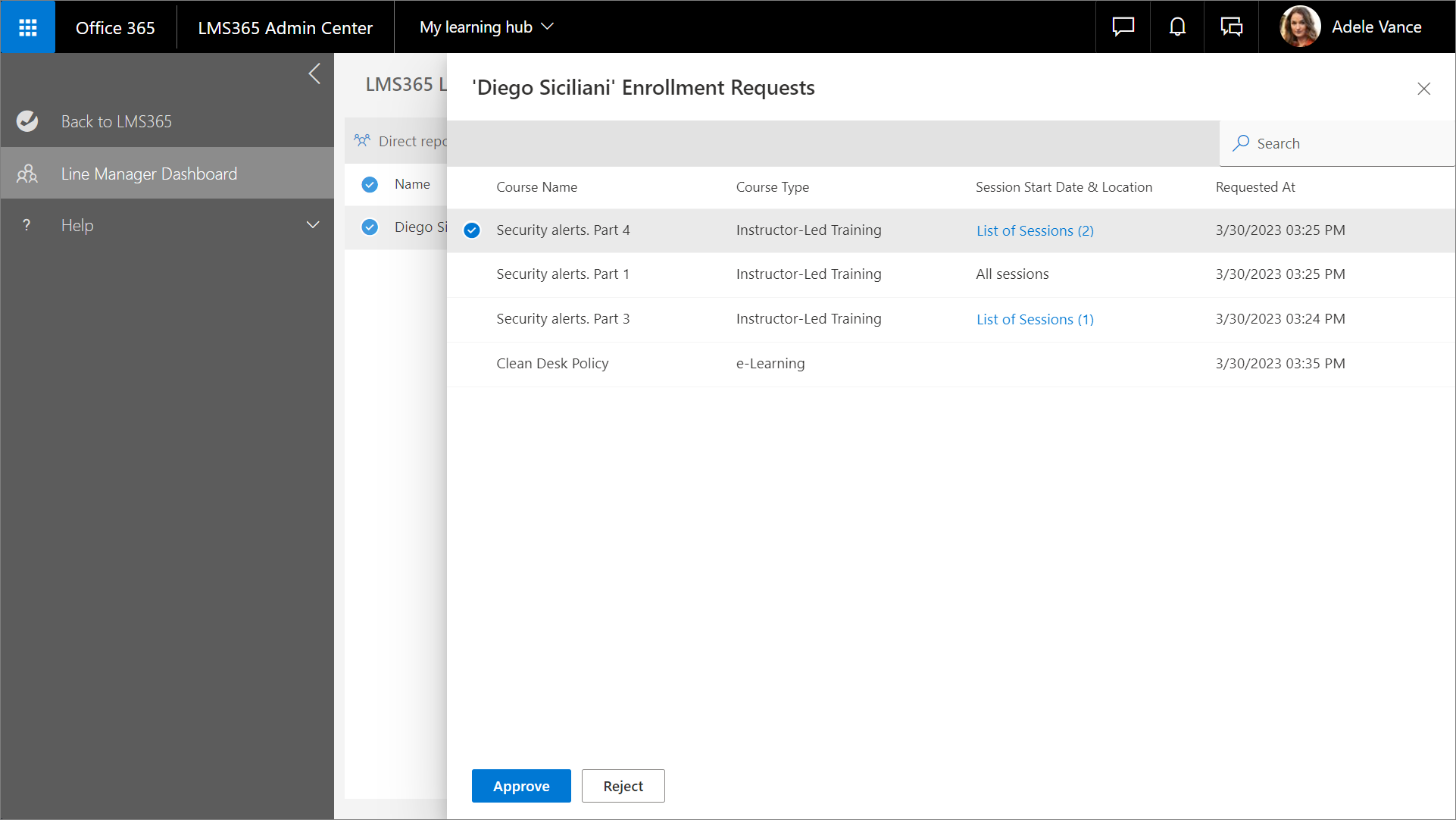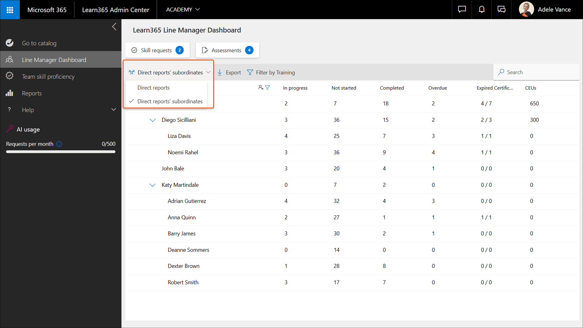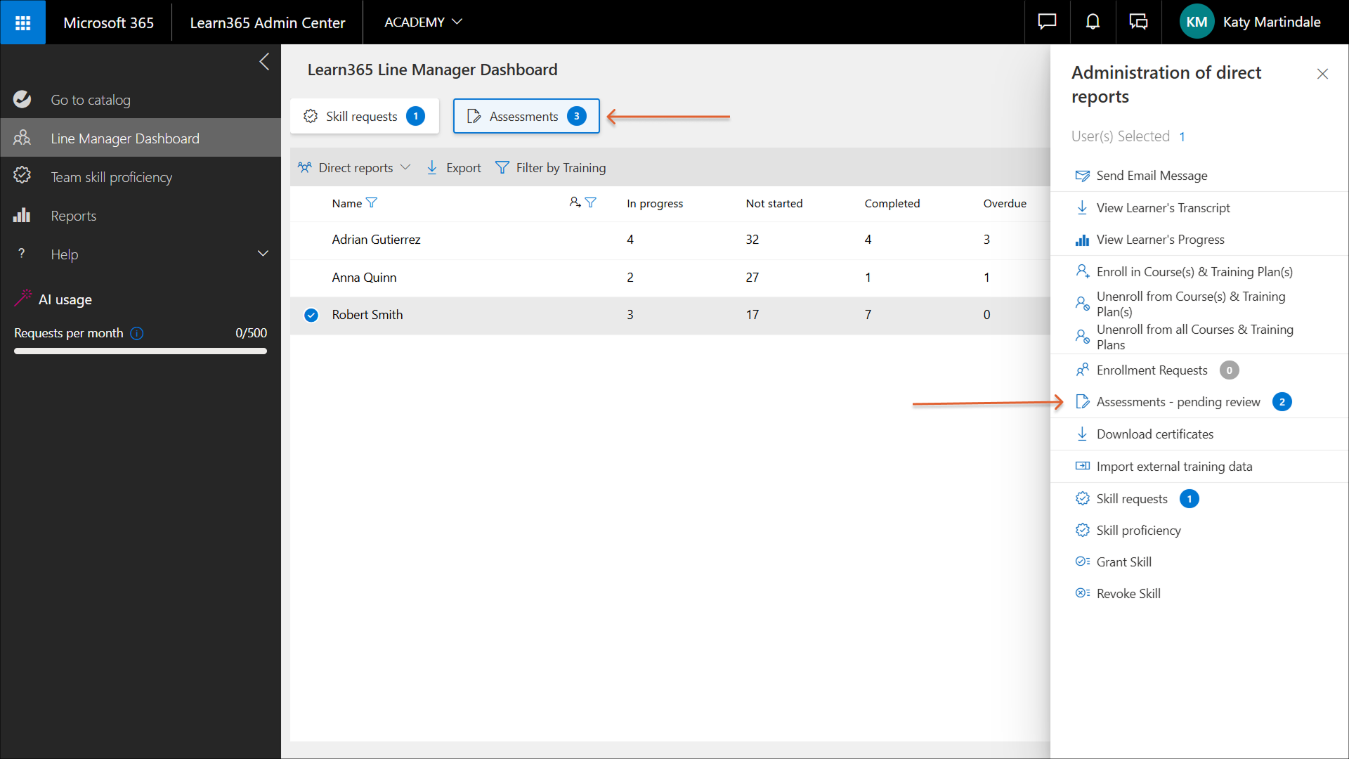 1. Wählen Sie im Linienmanager-Dashboard den gewünschten Lernenden aus. Der Bereich Verwaltung der direkten Mitarbeiter wird geöffnet.