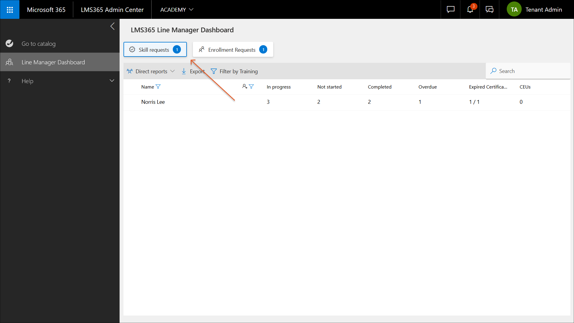 3. Wählen Sie Qualifikationsanfragen aus. Die Zahl neben dieser Option zeigt die Anzahl der Anfragen dieses Lernenden im aktuellen Katalog an.