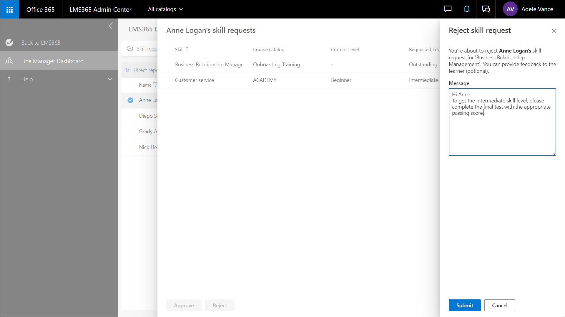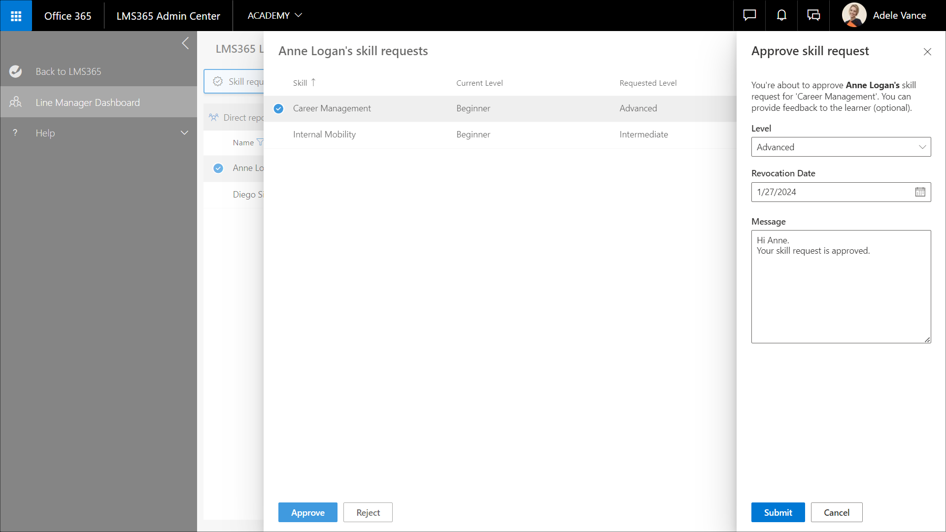 3. Klicken Sie auf Senden, um die ausgewählte Qualifikationsstufe zu genehmigen. Um den Vorgang abzubrechen, wählen Sie Abbrechen aus.