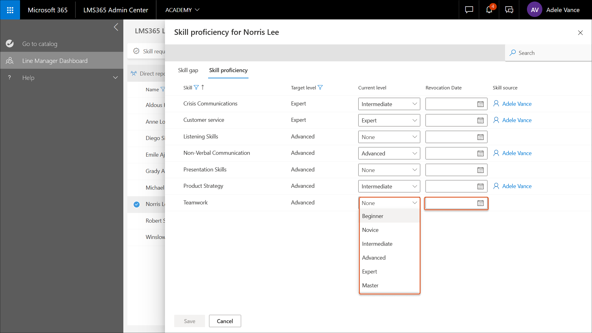 Zum Anzeigen des Qualifikationslevels eines Lernenden gehen Sie zum Linienmanager-Dashboard und wählen den gewünschten Lernenden aus. Im Bereich Verwaltung der direkten Mitarbeiter wählen Sie Qualifikationslevel aus. Der Bereich Qualifikationslevel öffnet sich.