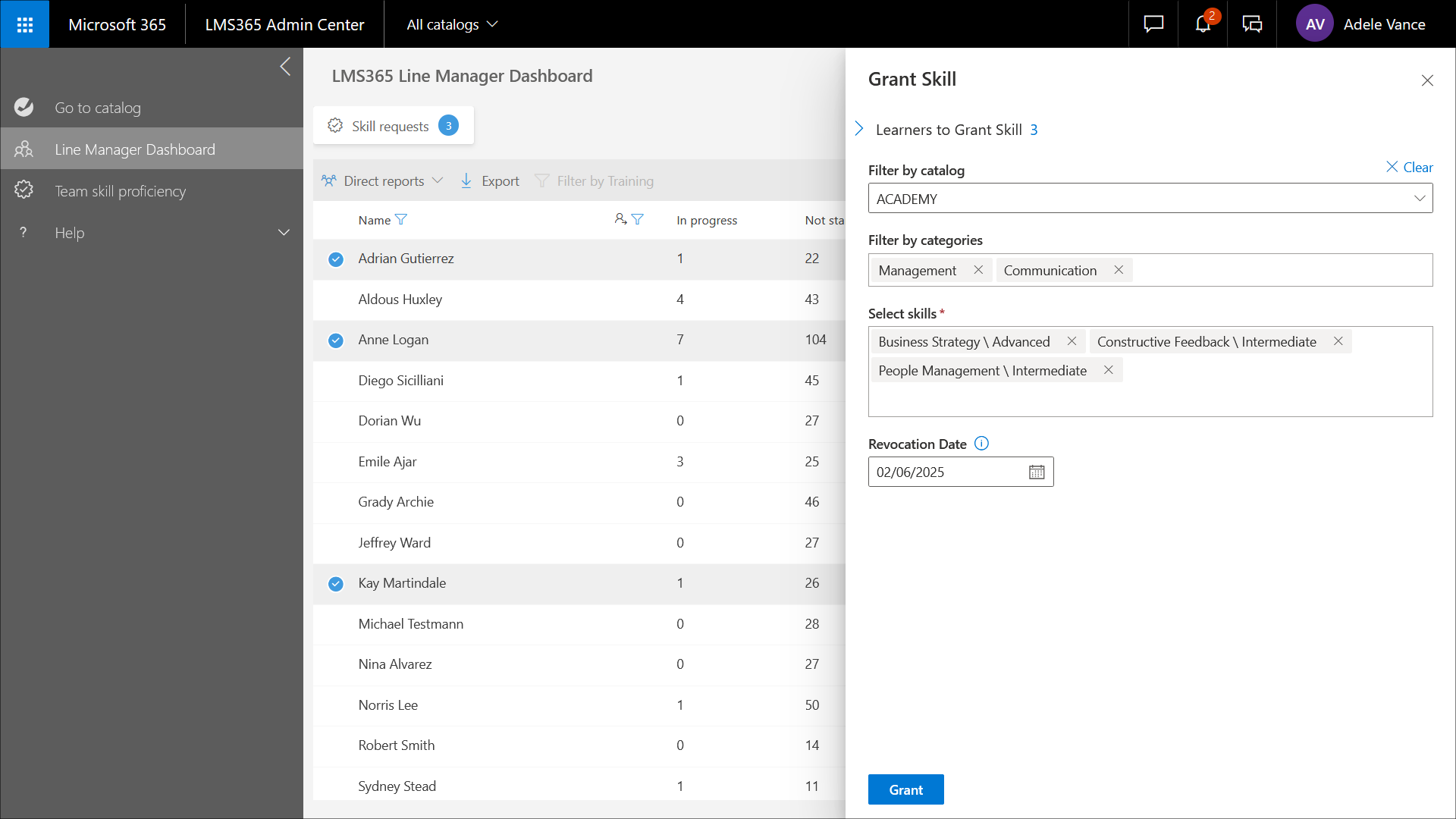 5. Wenn alles gut aussieht, wählen Sie Gewähren aus, um den ausgewählten Lernenden die Qualifikationen zuzuerkennen.