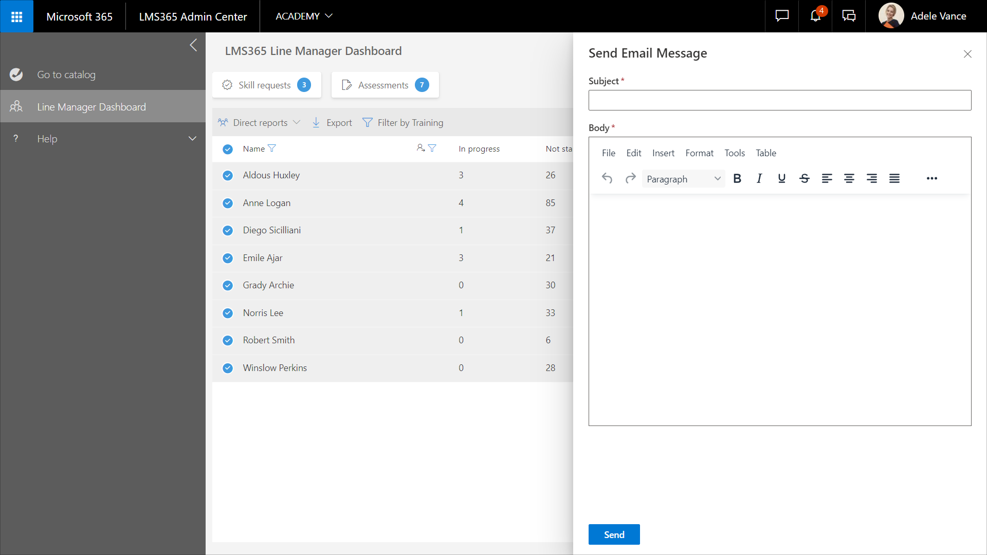 Damit Sie E-Mail-Nachrichten an Untergebene senden können, muss der Katalogadministrator die Microsoft 365-Verbindungseinstellungen konfigurieren. Informationen darüber, wie Sie die Microsoft 365-Verbindungseinstellungen im Learn365 Admin Center konfigurieren, finden Sie in diesem Artikel.