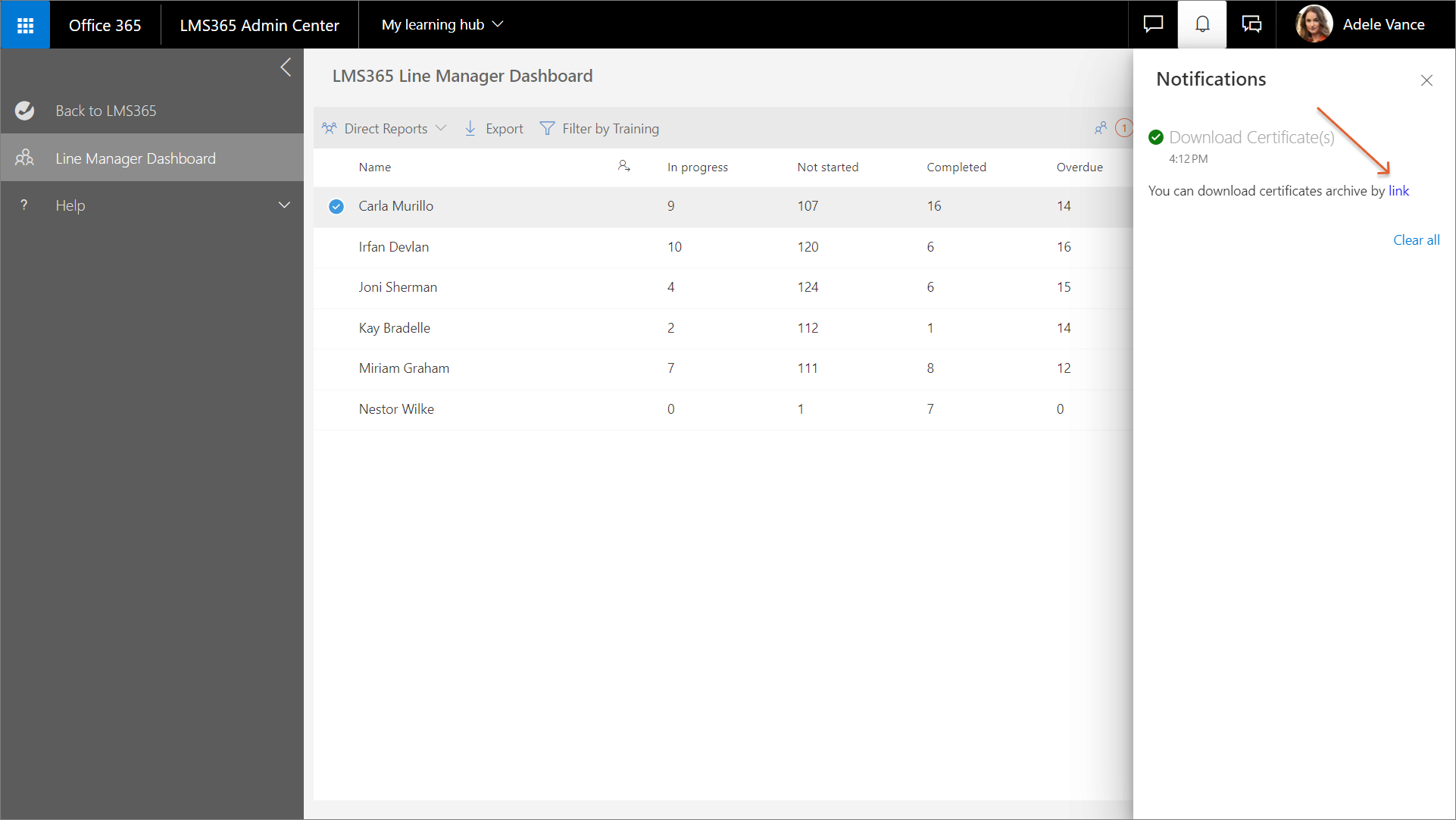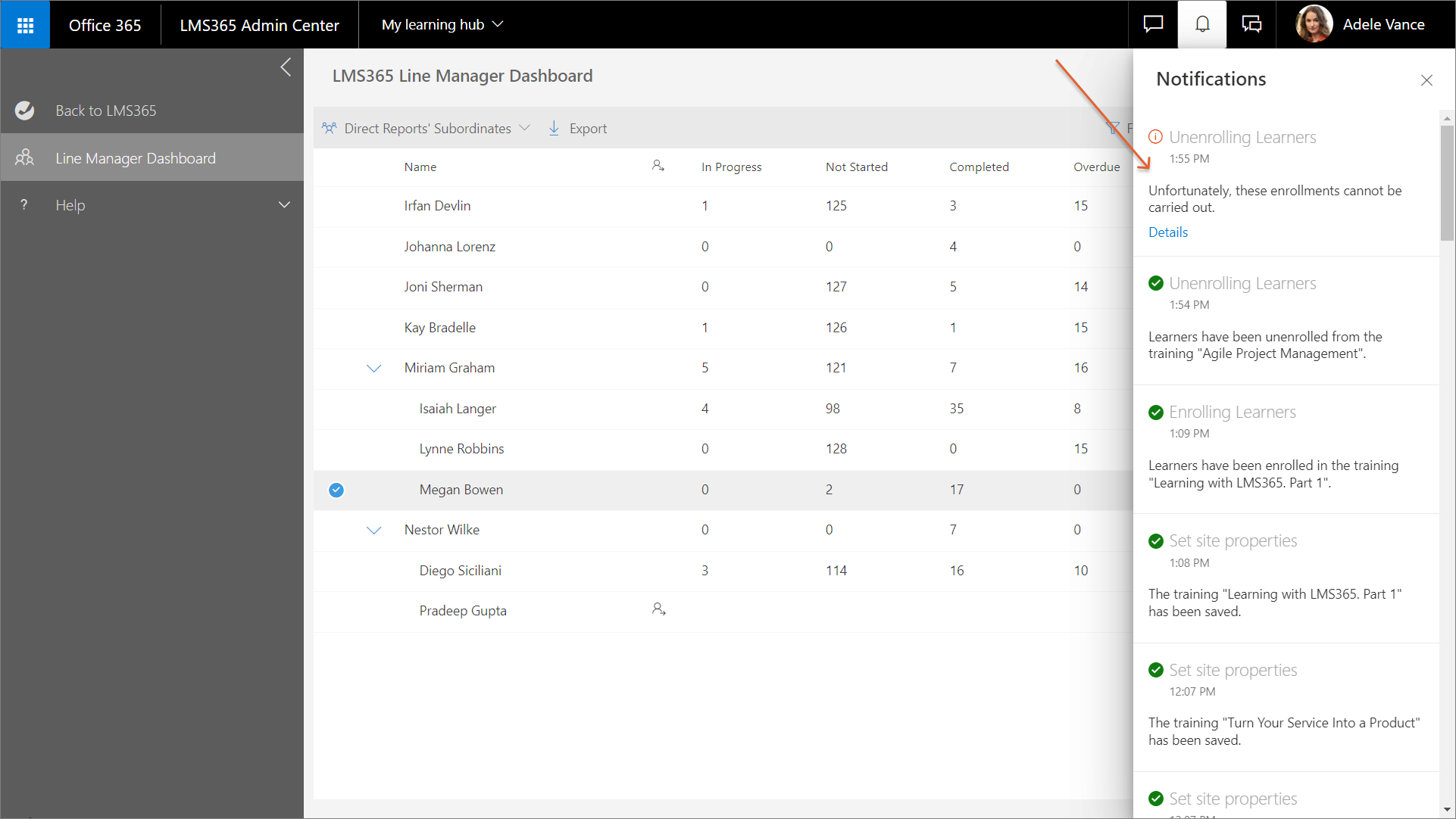 - Zeigen Sie die vollständigen Details zum Fortschritt eines bestimmten Lernenden für alle Kurse und Schulungspläne an. Informationen zum Lesen dieser Angaben im Bereich Fortschritt finden Sie in diesem Artikel.