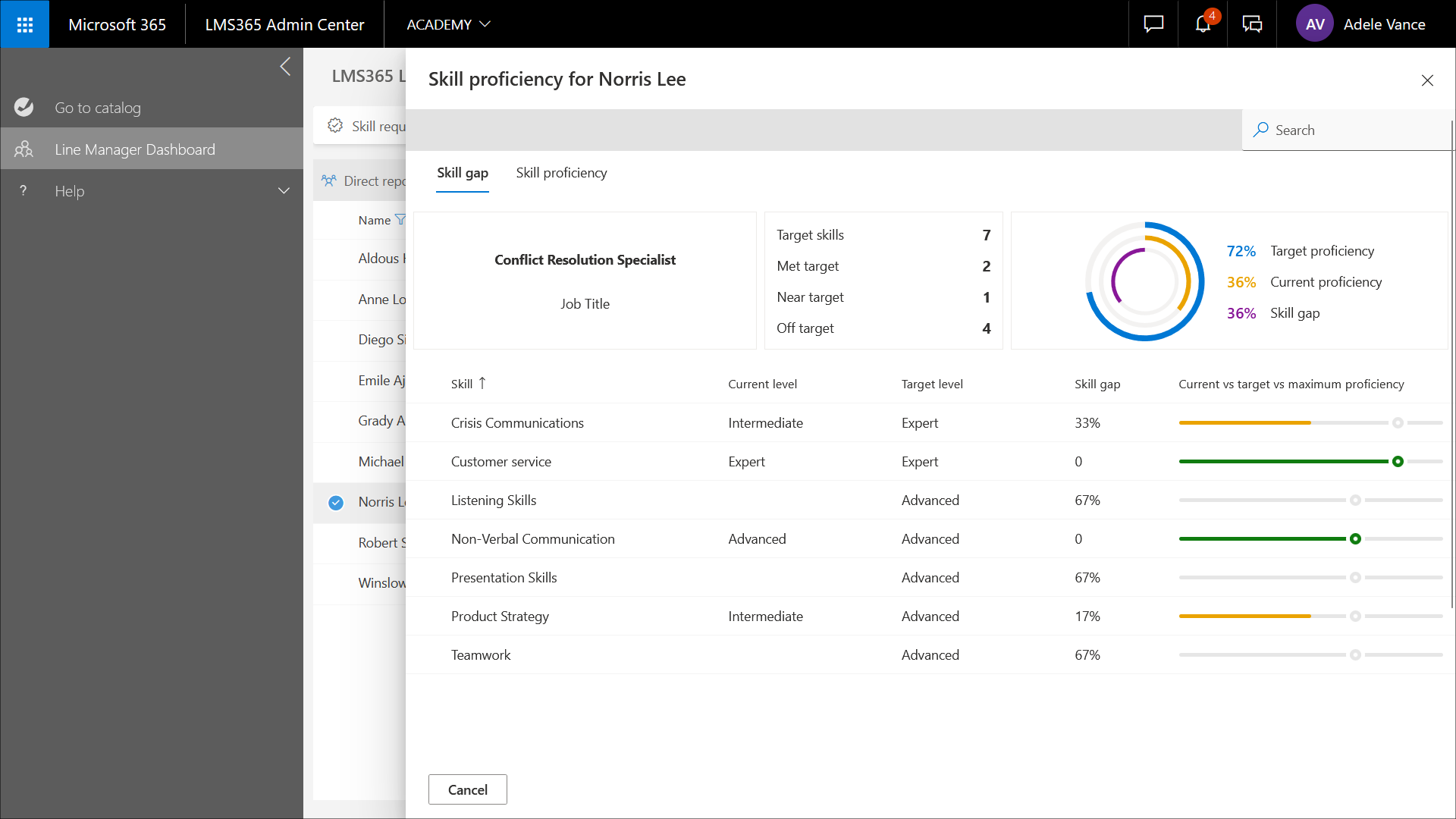 Linienmanager können über das Linienmanager-Dashboard Genehmigungen erteilen und Widerrufsdaten für die Zielqualifikationen ihrer Untergebenen festlegen. Ferner können sie sich einen Überblick über Qualifikationslücken der Lernenden verschaffen und ein detailliertes Diagramm anzeigen, das den durchschnittlichen Fortschritt bei allen Zielqualifikationen darstellt.