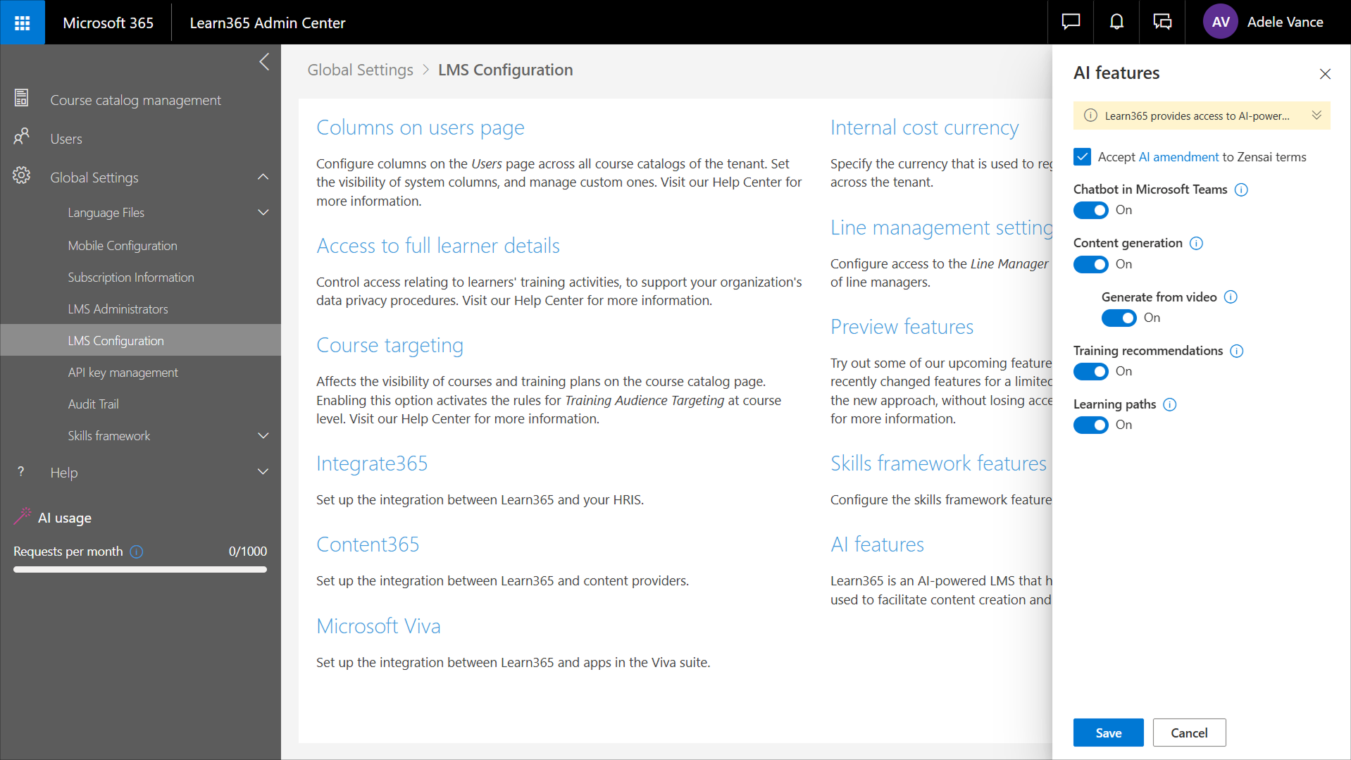 1. Gehen Sie im Learn365 Admin Center zu Globale Einstellungen > LMS-Konfiguration > KI-Funktionen.