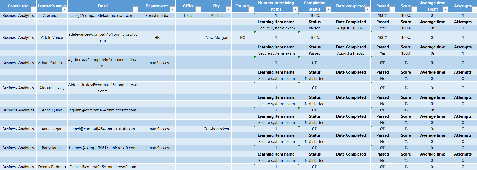 - Inaktiv. Der Bericht enthält Daten zum Quizabschluss für Benutzer, deren Konten in Microsoft Entra ID (vormals Azure Active Directory) deaktiviert oder gelöscht wurden, die jedoch für diesen Kurs registriert sind oder es irgendwann einmal waren. In diesem Fall sind nur inaktive Benutzer in der Dropdown-Liste Umfang auswählen enthalten.
