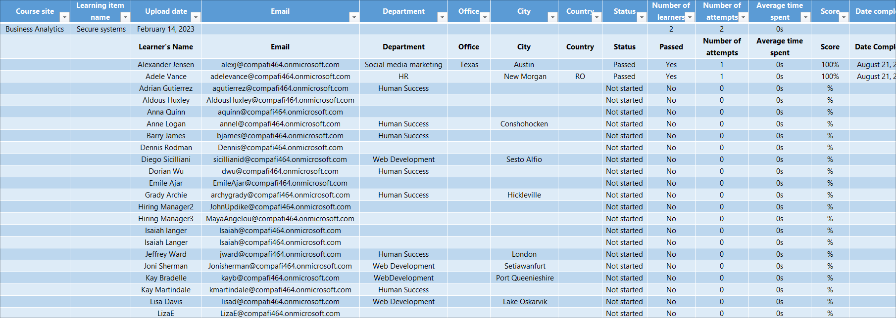 - Abschlussdatum. Datum, an dem der Lernende dieses Quiz abgeschlossen hat. Markieren Sie die Zelle, um die Uhrzeit des Abschlusses anzuzeigen.