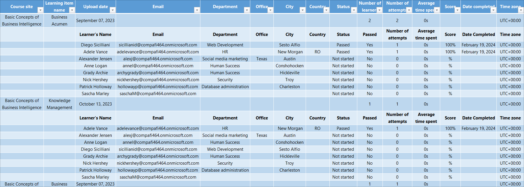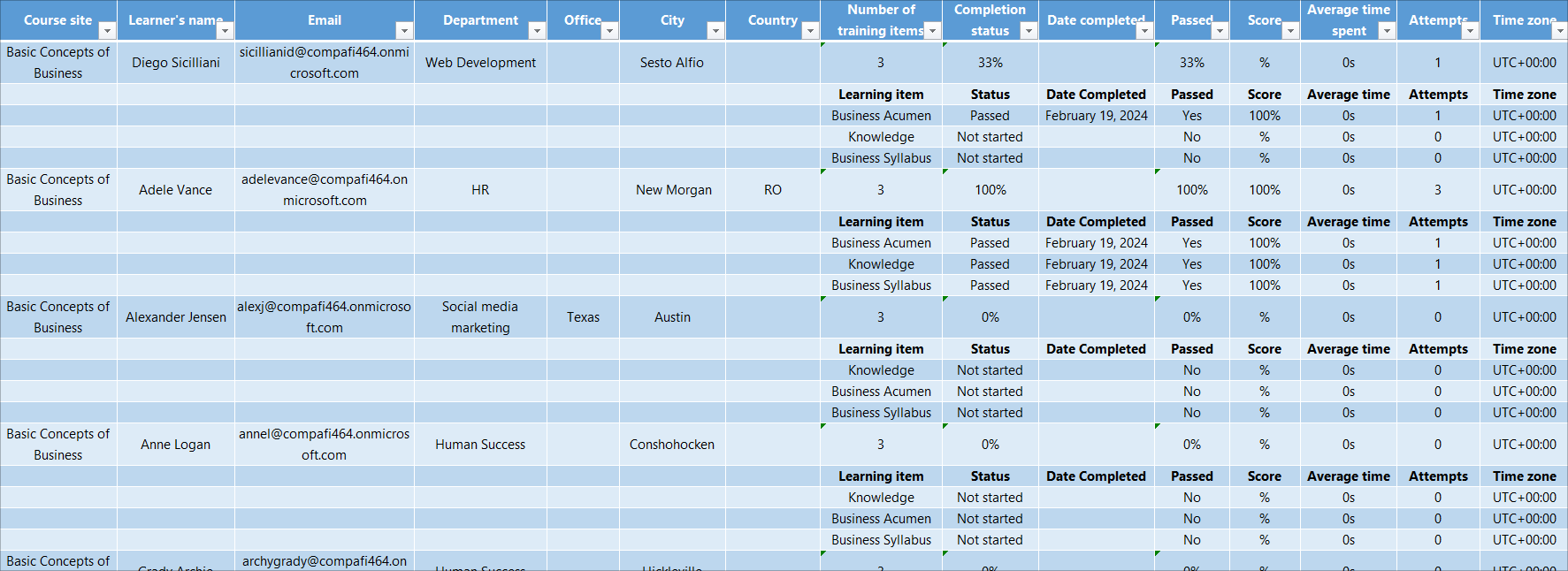 - Abschlussdatum. Datum, an dem der Lernende dieses Lernmodul abgeschlossen hat. Markieren Sie die Zelle, um die Uhrzeit des Abschlusses anzuzeigen.