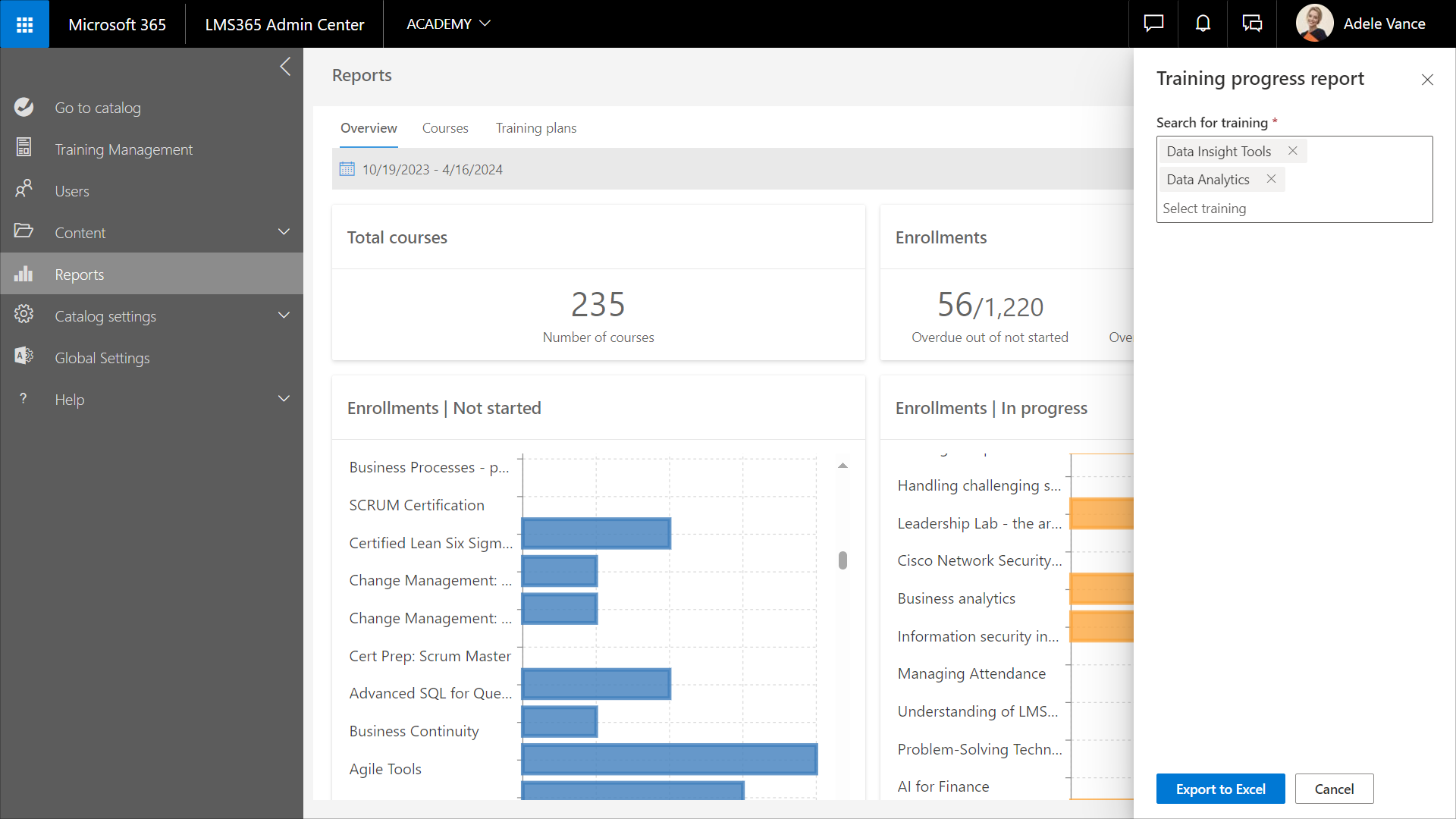Der Bericht Schulungsfortschritt ist im Learn365 Admin Center in zwei Bereichen verfügbar. Informationen zum Erstellen dieses Berichts über die Seite Schulungsverwaltung finden Sie in diesem Artikel.