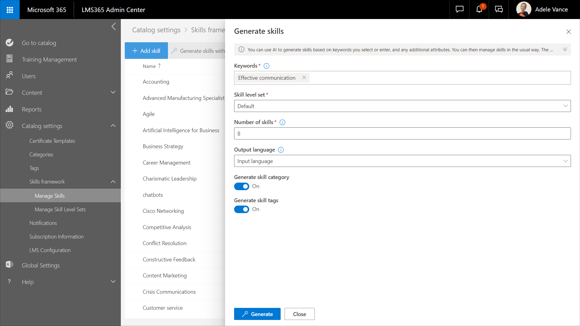 1. Gehen Sie zu Learn365 Admin Center > Katalogeinstellungen > Qualifikationsframework > Qualifikationen verwalten > Qualifikationen mit KI generieren. Der Bereich Qualifikationen generieren wird geöffnet.