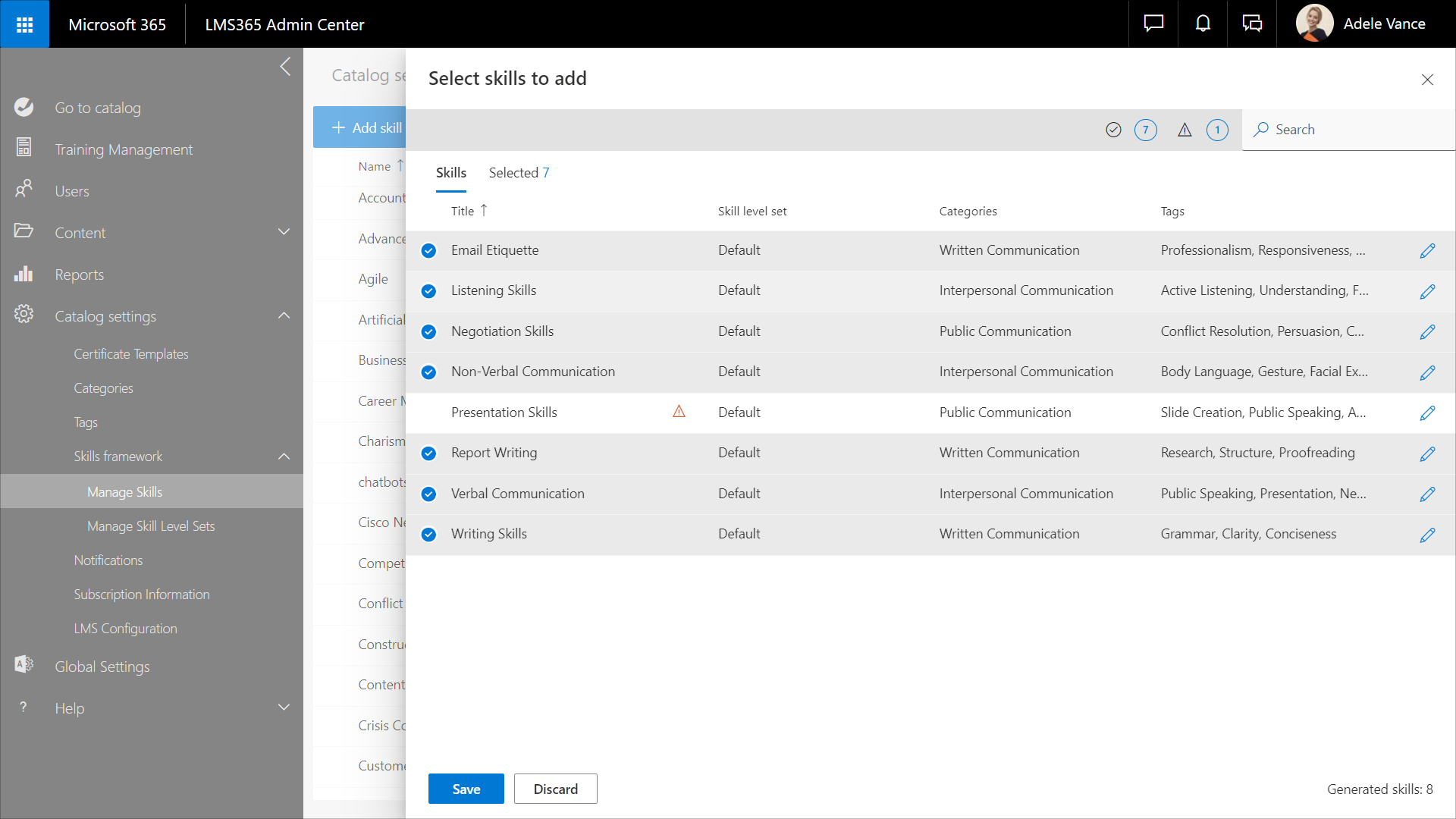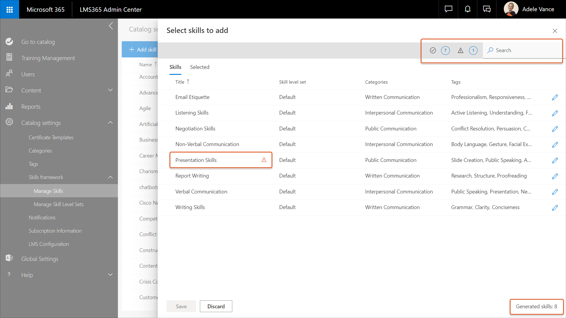 12. Klicken Sie zum Speichern der ausgewählten Qualifikationen auf Speichern oder aber auf Verwerfen, um sie zu verwerfen. Wenn Sie KI-generierte Qualifikationen verwerfen, gehen diese verloren. Dieser Vorgang kann nicht rückgängig gemacht werden.