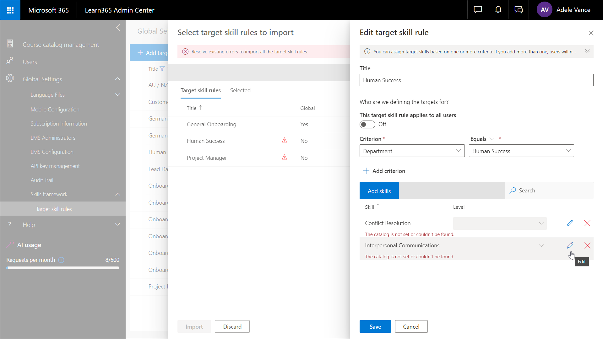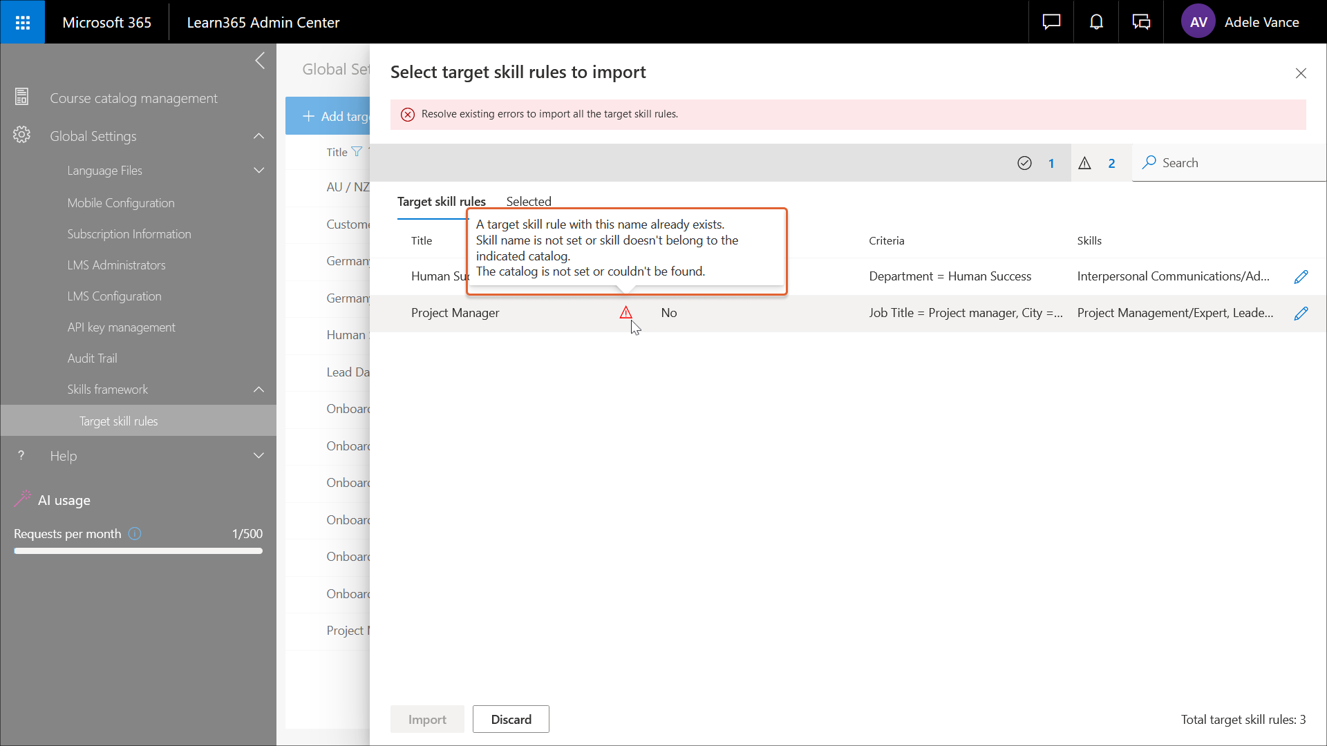 - Regeln für Zielqualifikationen werden nicht importiert, wenn sie sich auf Katalognamen beziehen, die in Learn365 dupliziert sind.