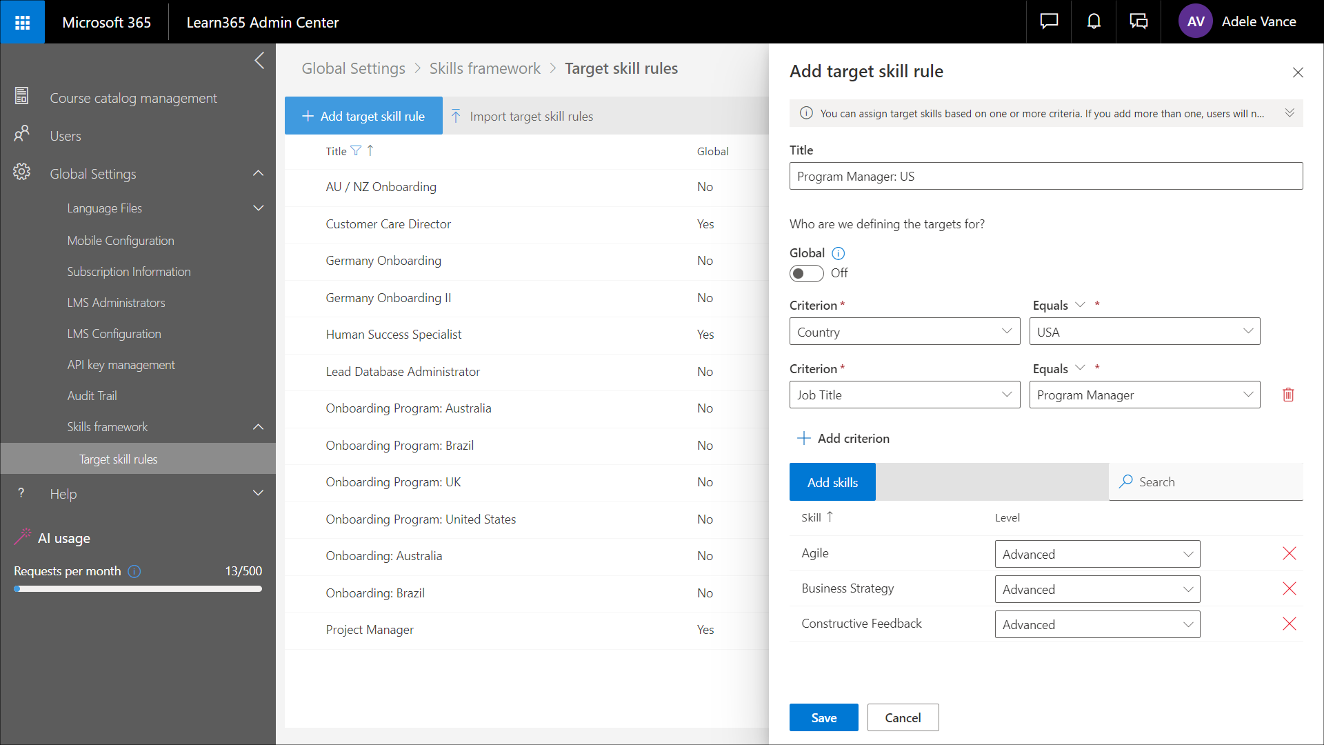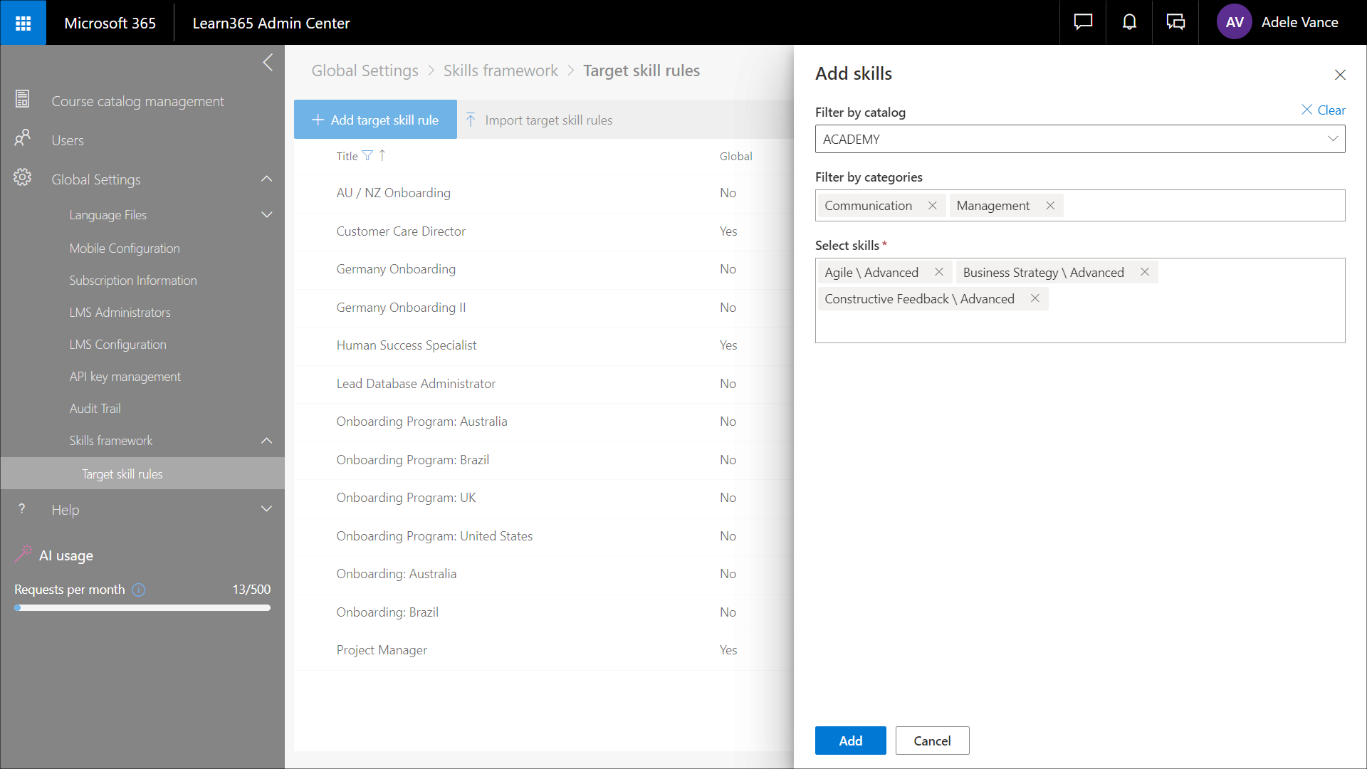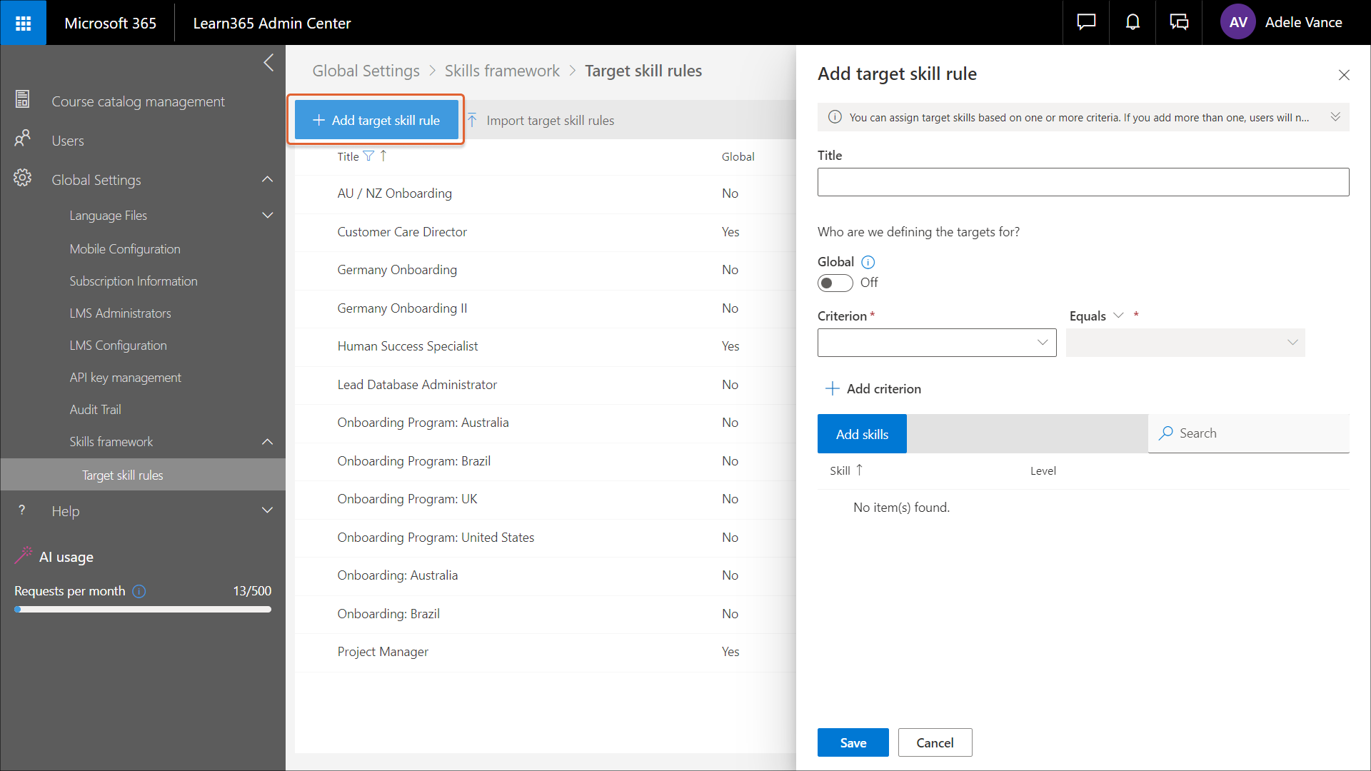 1. Gehen Sie zum Learn365 Admin Center > Globale Einstellungen > Qualifikationsframework > Regeln für Zielqualifikationen.
