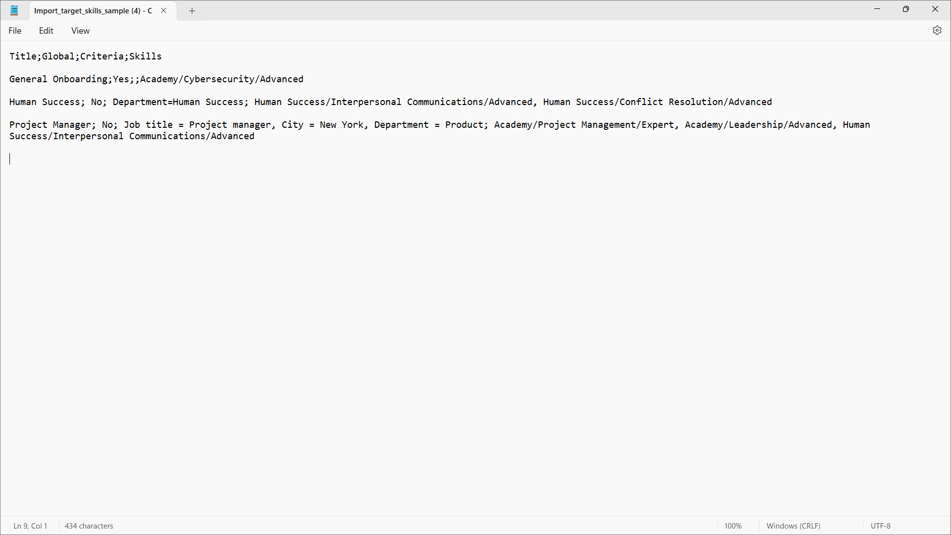 - Die Felder Titel, Global, Kriterien und Qualifikationen müssen durch ein Semikolon (;) getrennt werden.