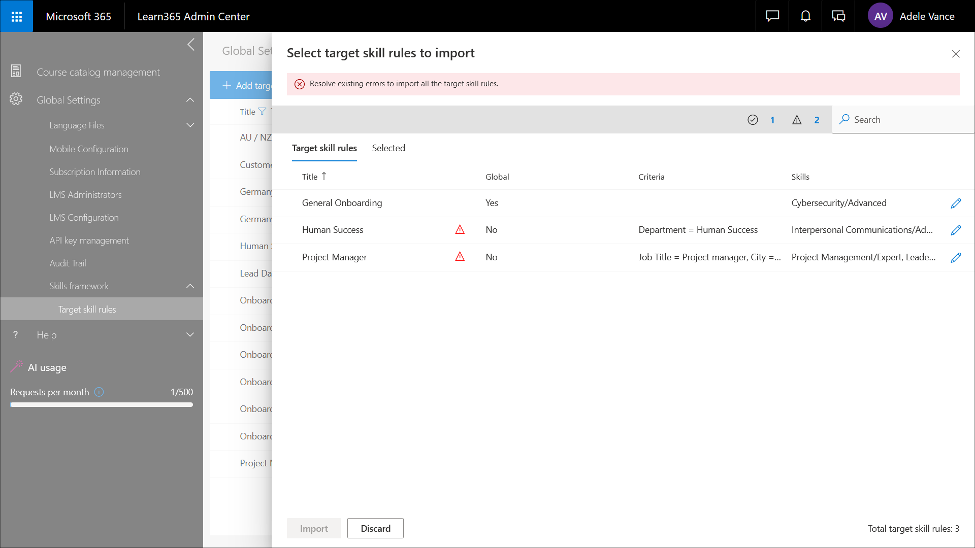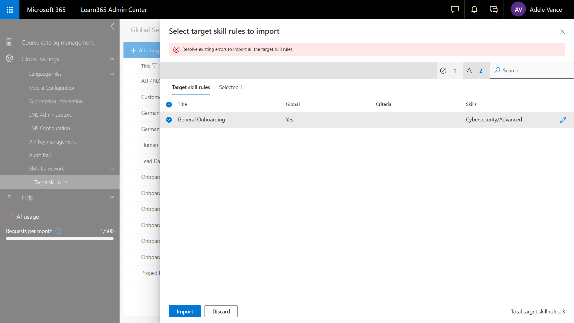 Wählen Sie Importieren, wenn Sie bereit sind, die ausgewählten Qualifikationen zu importieren. Sie sehen den Importstatus der Regel für Zielqualifikationen unter Benachrichtigungen (das Glockensymbol).