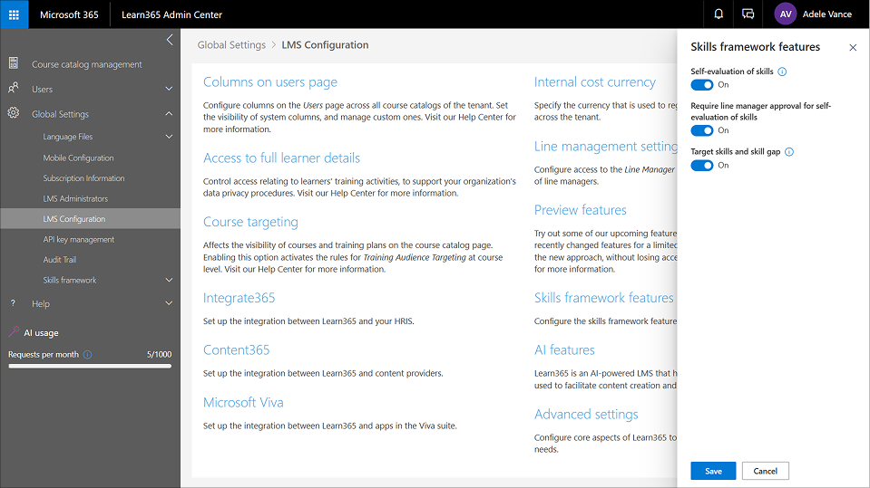 Um die Funktionen Zielqualifikation und Qualifikationslücke zu aktivieren, gehen Sie zum Learn365 Admin Center > LMS-Konfiguration > Globale Einstellungen > Qualifikationsfunktionen und stellen Sie den Schalter Zielqualifikationen und Qualifikationslücke auf Ein.