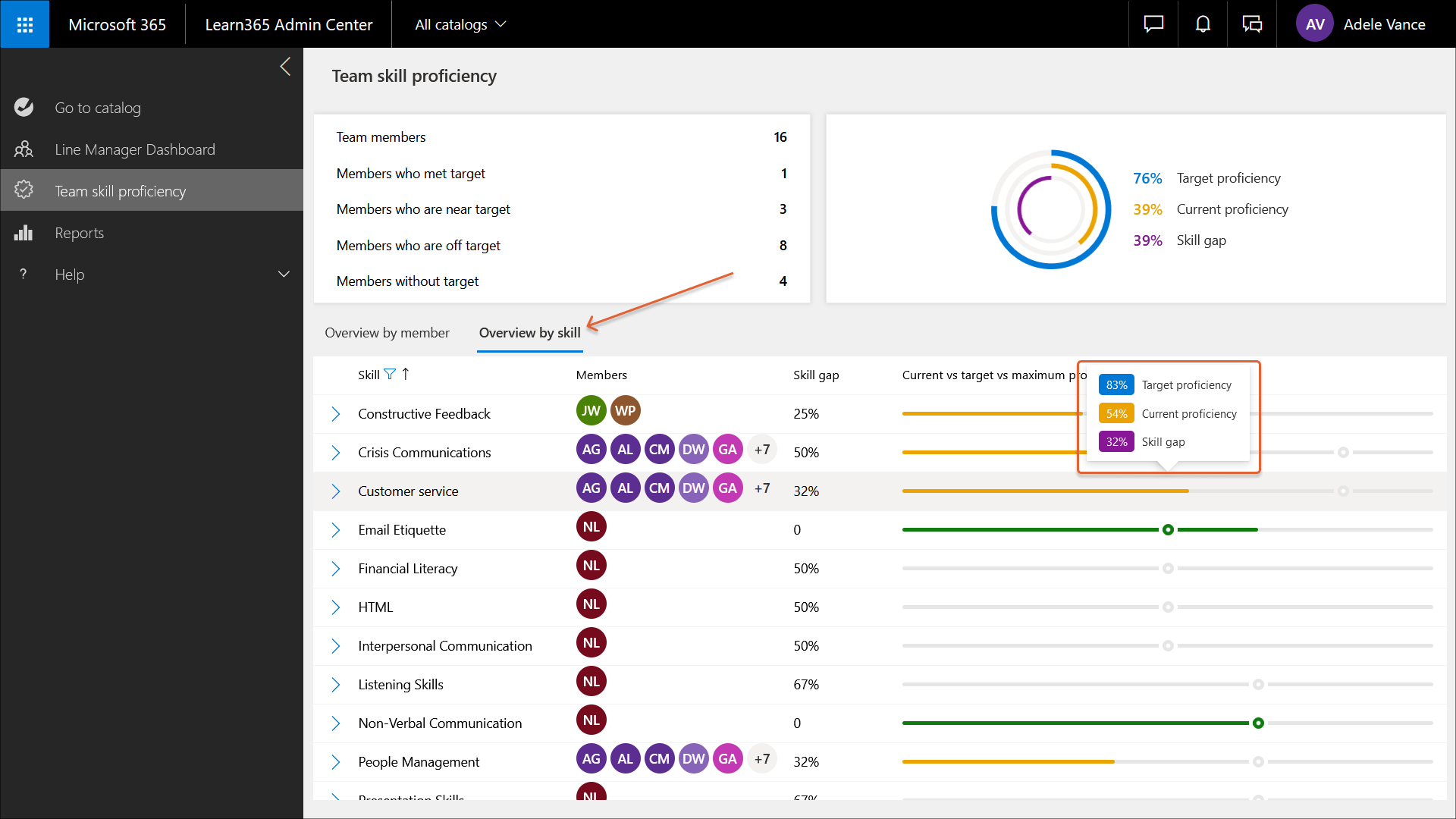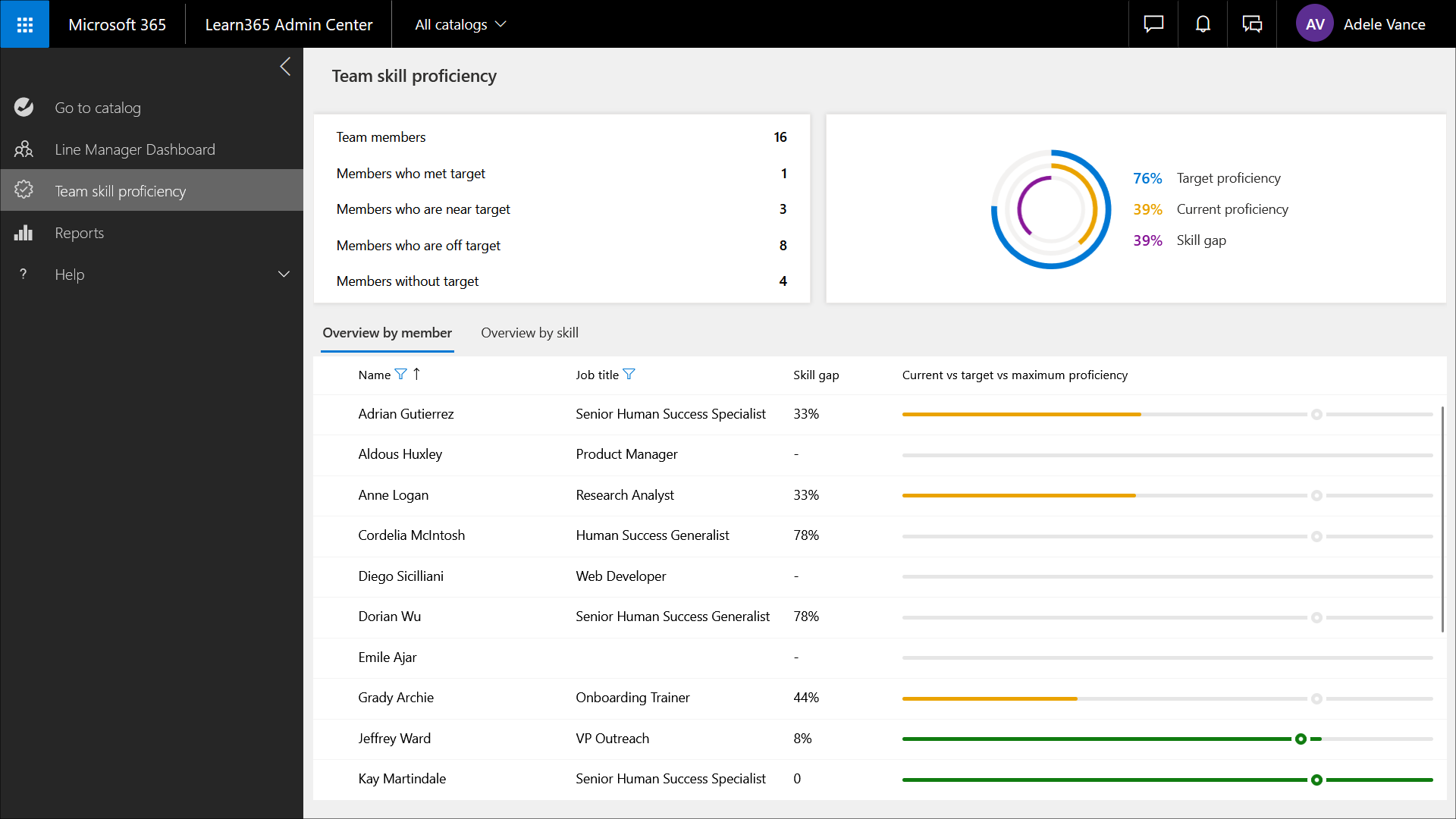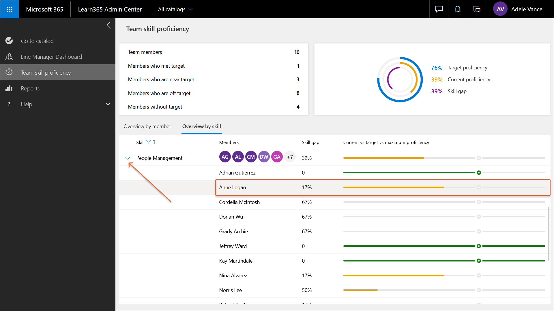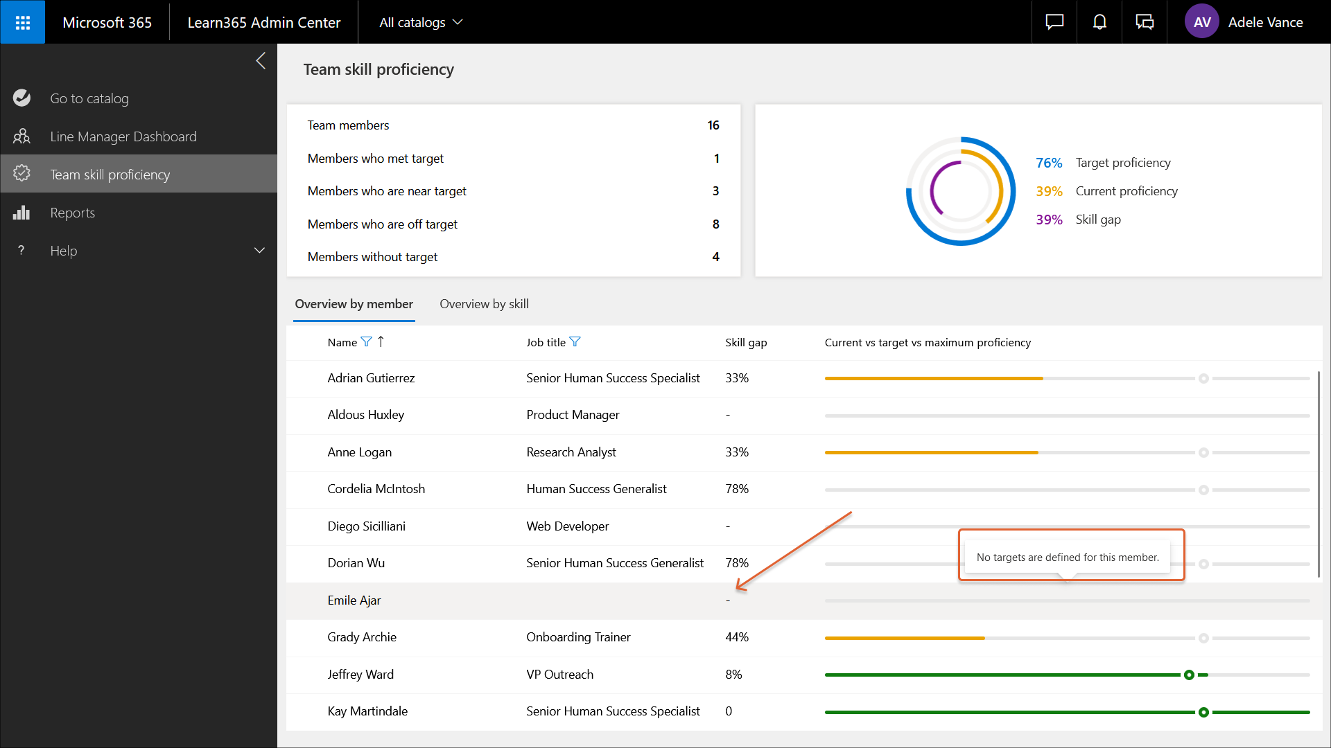 Adele Vance ist Linienmanager eines 16-köpfigen Teams. Von ihren direkten Mitarbeitern gehören 12 zur Abteilung Human Success, und für sie wurde als Zielqualifikation „Personenführung“ definiert. Die übrigen vier Teammitglieder kommen aus anderen Abteilungen und haben keine definierten Qualifikationsziele. Daher werden bei der Berechnung der Durchschnittsprozentwerte für Qualifikationskompetenz und -lücken im Bereich Personenführung in Adeles Team nur die Angaben zu denjenigen 12 Personen berücksichtigt, für die diese Qualifikation als Ziel definiert ist.