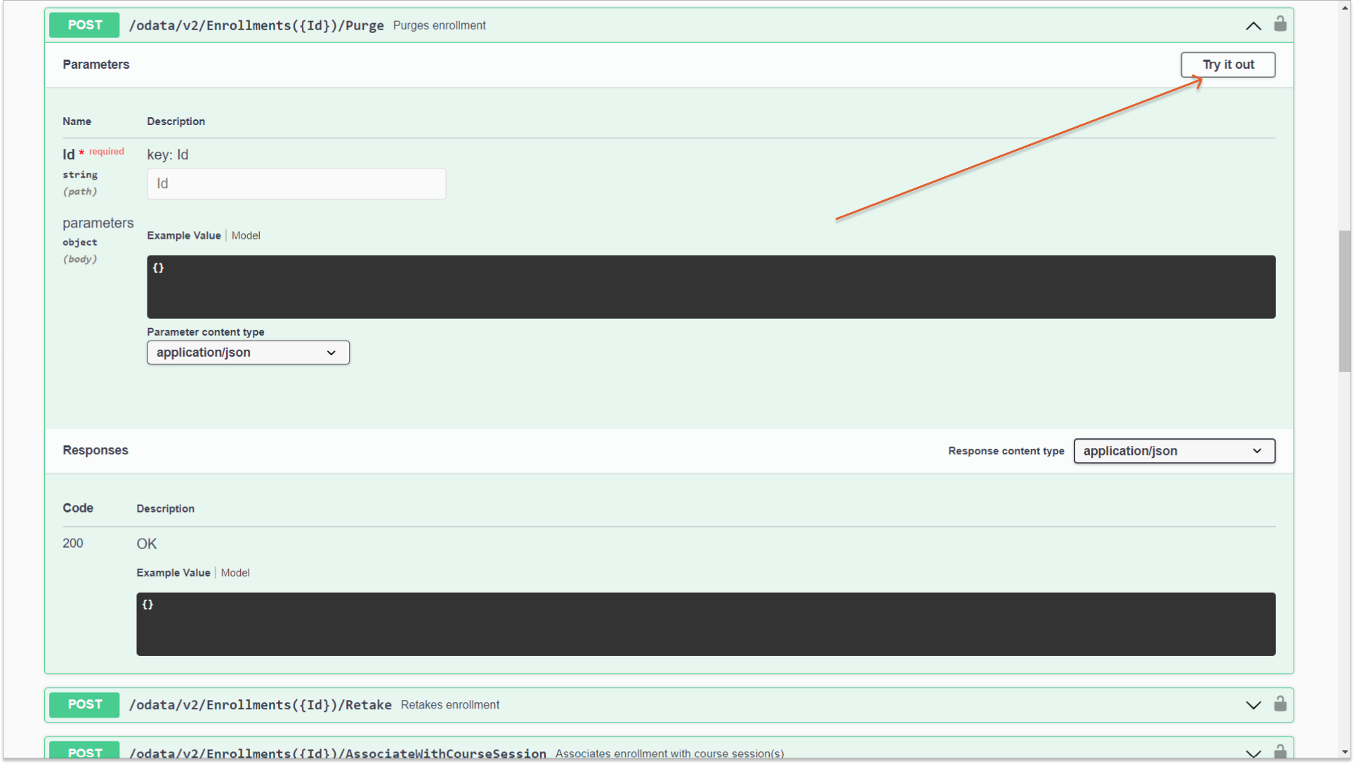 2. Wählen Sie im Abschnitt Enrollments den Endpunkt POST /odata/v2/Enrollments({Id})/Purge und klicken Sie oben rechts auf Try it out.