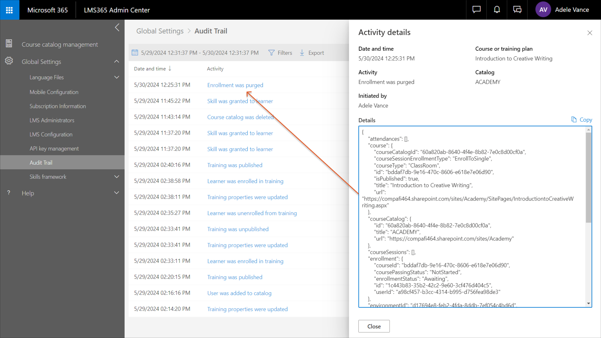 6. Gehen Sie zu Learn365 Admin Center > Globale Einstellungen > Audit-Trail.