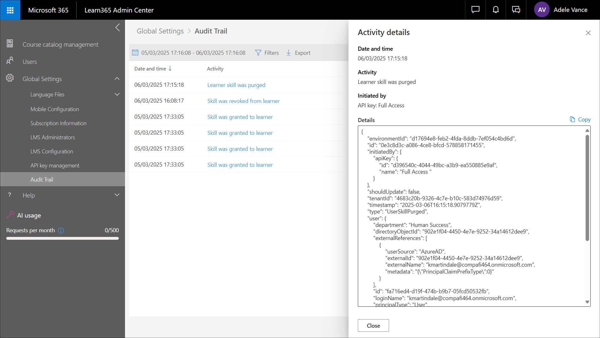 8. Suchen Sie nach dem letzten Datensatz mit dem Aktivitätsnamen Learner skill level was purged und wählen Sie ihn aus, um weitere Informationen anzuzeigen.