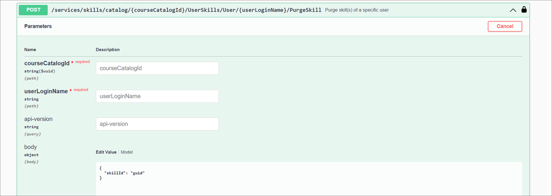 2. Wählen Sie im Abschnitt UserSkills den Endpunkt POST /services/skills/catalog/{courseCatalogId}/UserSkills/User/{userLoginName}/PurgeSkill und dann oben rechts die Option Try it out aus.