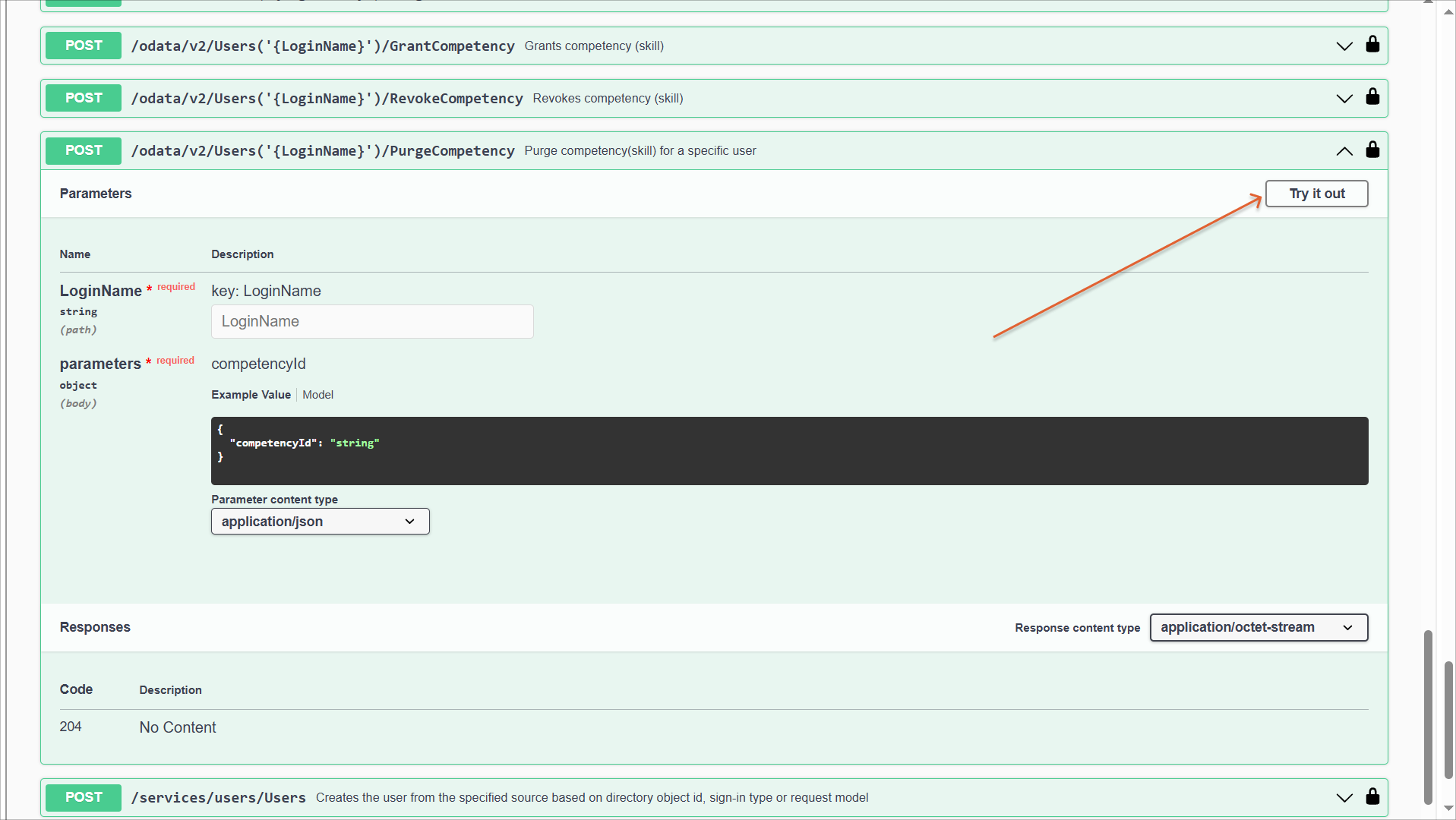 2. Wählen Sie im Abschnitt Users den Endpunkt POST /odata/v2/Users(‘{LoginName}’)/PurgeCompetency und klicken Sie oben rechts auf Try it out.